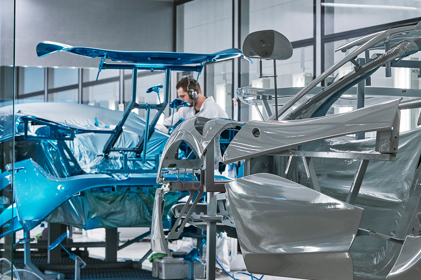 An early P1, the first plug-in hybrid sports car to roll off the McLaren production line, is parked in front of the glass-fronted paint shop. Here you can view vehicles like the Senna, a limited-edition mid-engine sports car, receiving a coat. I spy some panels being painted the British supercar maker’s signature orange. Why this hue? It’s reported that in 1967 Bruce McLaren (the Kiwi racing driver after whom the company is named) wanted his cars to stand out from the pack and show up like beacons on colour TV. The shade stuck. In fact, McLaren’s latest Longtail release, the 765LT, was launched in Nardo Orange — a lobster pinky-orange version of the company’s favourite shade.