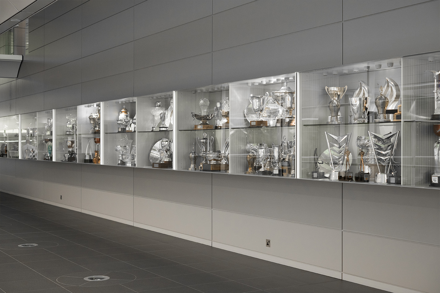 The boulevard narrows and I’m quickly ushered past the wind tunnel, which is used to help test aerodynamics and airflow. No filming allowed here. I’m then led through the trophy corridor. Reckon you have an impressive pool room stuffed with relics of your past victories? You ain’t seen nothing! The MTC boasts the biggest private collection of motor-racing trophies in the world. Interestingly, winning drivers don’t get to take home the silverware. Success is considered a team effort and, as such, all the bling belongs to McLaren.