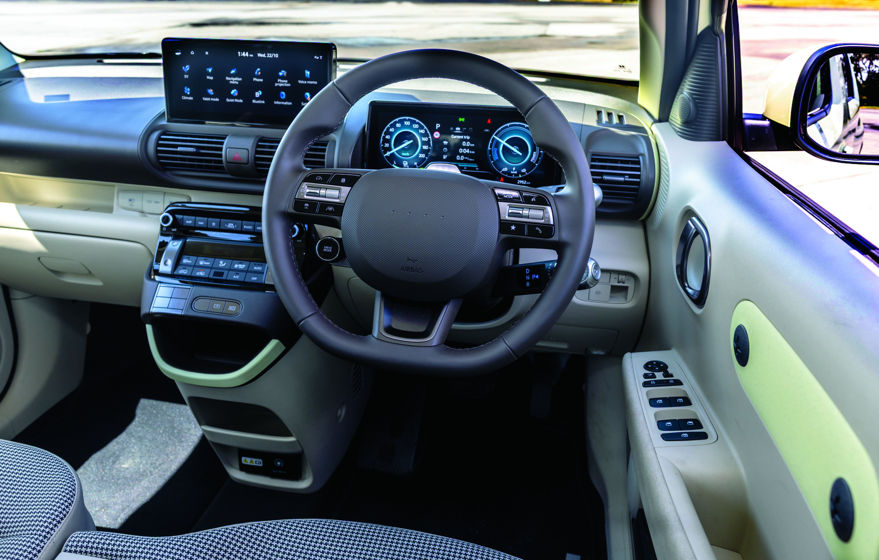 This variant of the Inster has the larger battery which extends range to a claimed 360km. Three-twenty will be closer to the truth. Charging is easily achieved overnight on a household wall-box (call it seven hours from 10 to 100 per cent charged) and the wee Hyundai can also cope with up to 120kW on a DC fast-charger. At which point you’re looking at going from 10 to 80 per cent charged in 20 minutes.