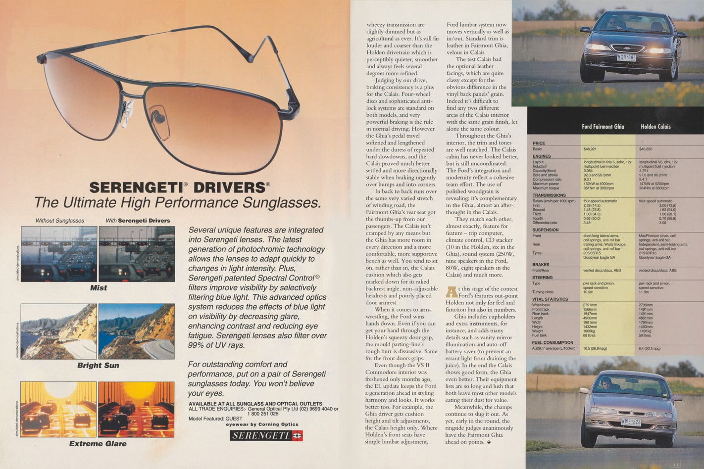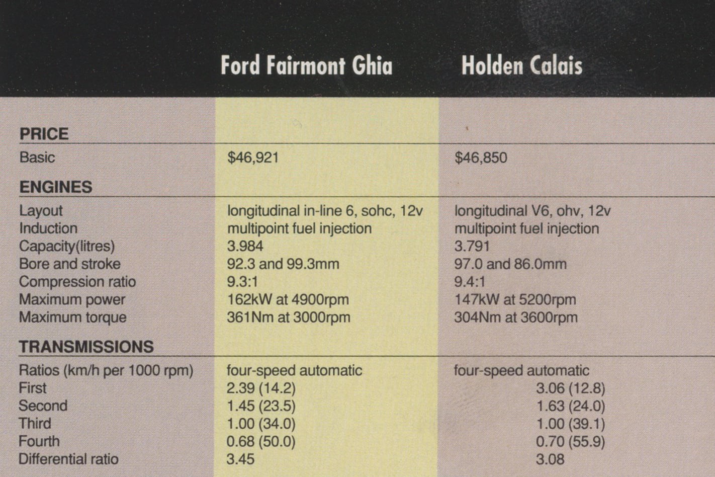 At this stage of the contest Ford’s features out-point Holden not only for feel and function but also in numbers. Ghia includes cupholders and extra instruments, for instance, and adds many details such as vanity mirror illumination and auto-off battery saver (to prevent an errant light from draining the juice). In the end the Calais shows good form, the Ghia even better. Their equipment lists are so long and lush that both leave most other models eating their dust for value.