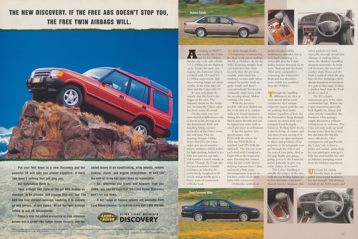 On the road, you very soon find that differences exist as much in the driving as in the dimensions. Ride and handling bring constant reminders of the Ghia’ s extra size and mass. Not the steering, though. Unlike lower-line ELs, the Ghia sedan gets speed-sensitive power assistance which makes for light parking. Indeed it is a little too easy for our taste, and remains a touch remote at speed. Though the Calais also has speed-sensitive variable assistance, its wheel is the more firmly weighted at all speeds and generally gives a better sense of connection with the road.