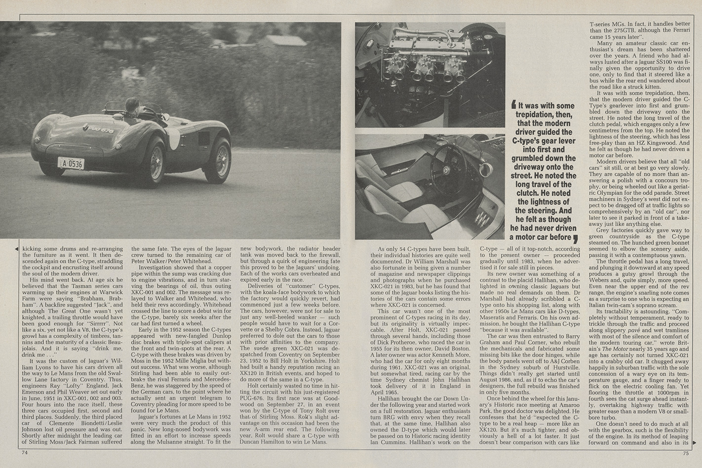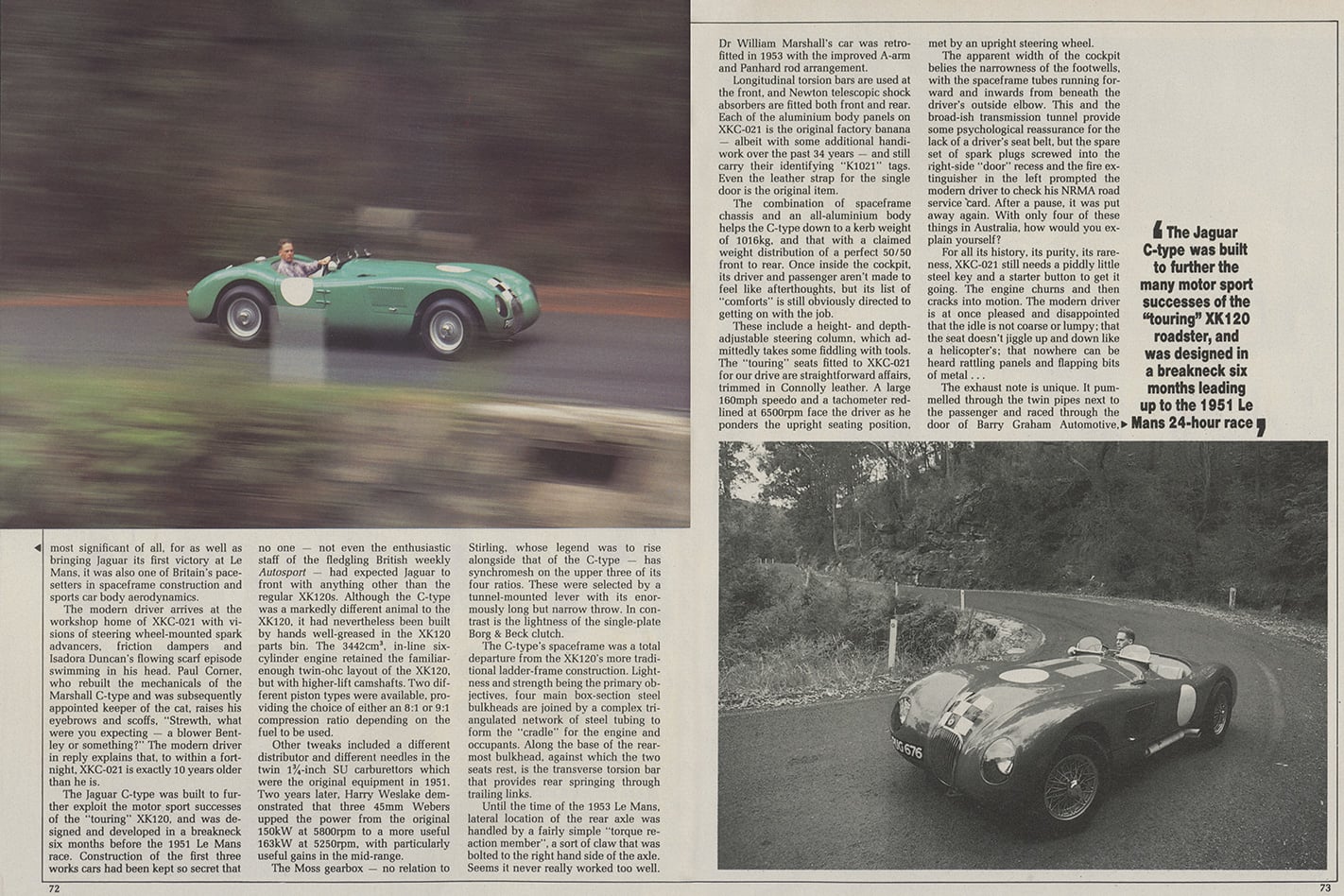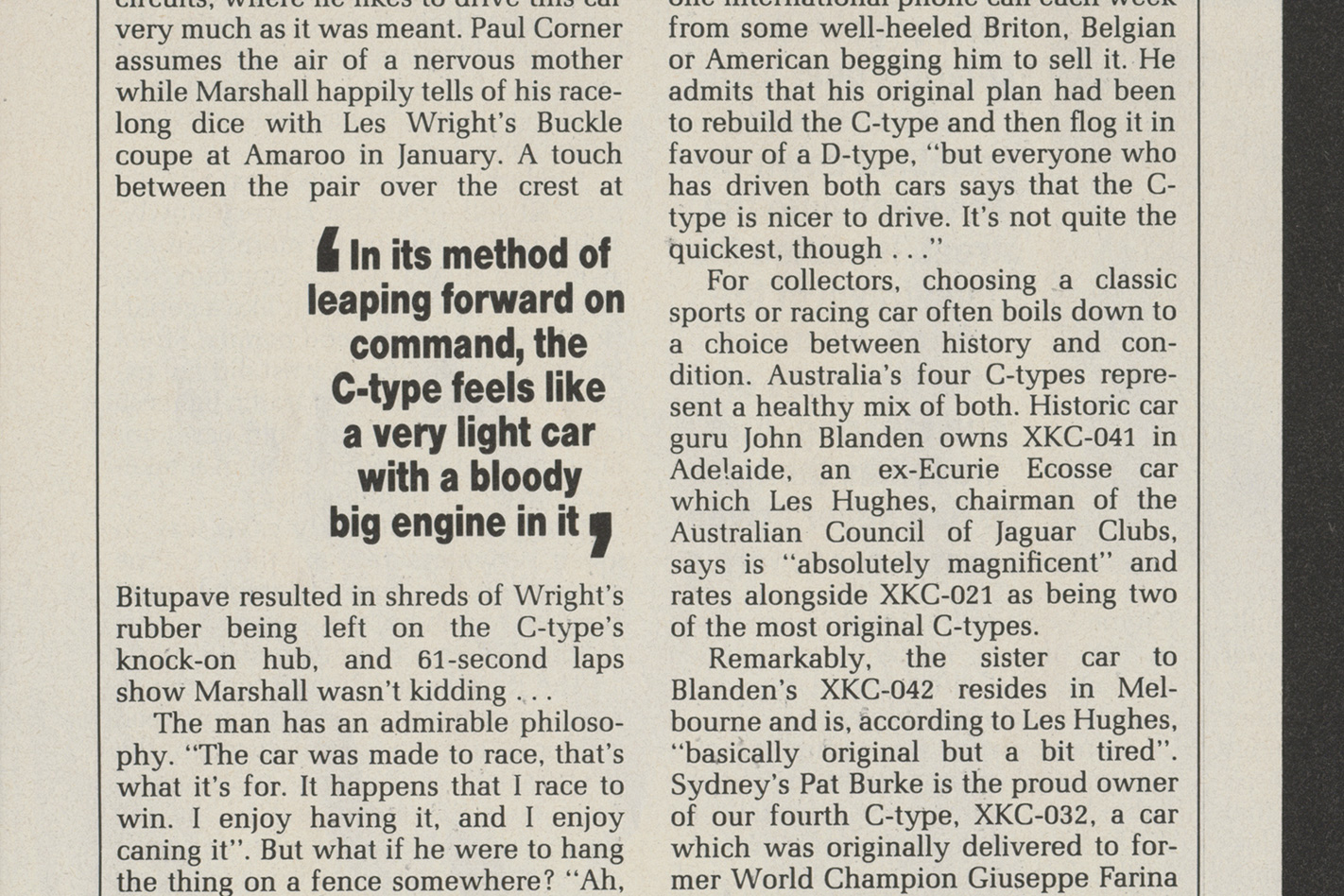 Competing overseas will also do no harm to the car’s value. for these events function as the meeting place for the international classic car clique. Like Australia’s three other C-types, XKC-021 is known intimately to hundreds of would-be owners who have never even seen it. Or Marshall says he gets at least one international phone call each week from some well-heeled Briton, Belgian or American begging him to sell it. He admits that his original plan had been to rebuild the C-type and then flog it in favour of a D-type, “but everyone who has driven both cars says that the C-type is nicer to drive. It’s not quite the quickest, though … “