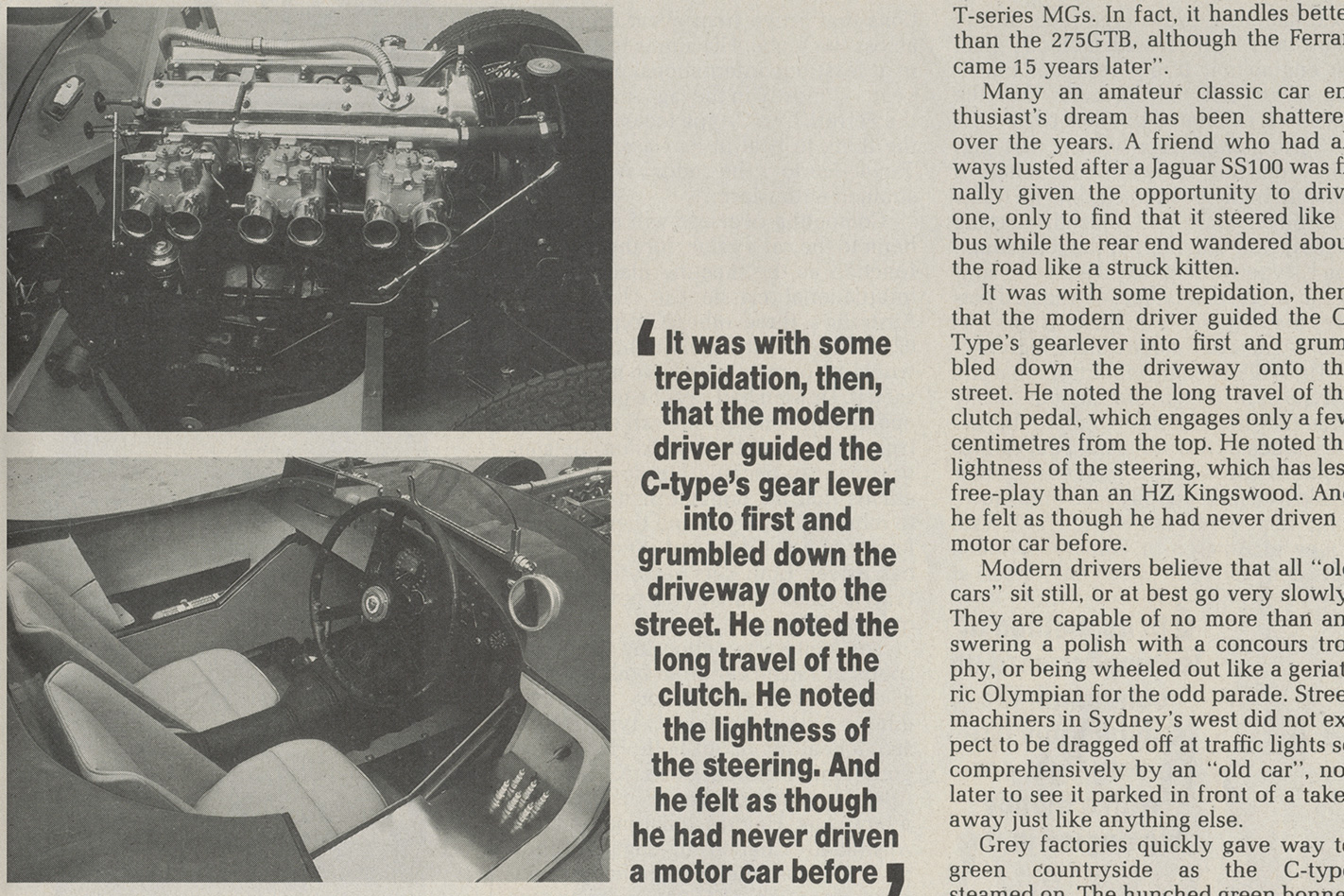 Once behind the wheel for this January’s Historic race meeting at Amaroo Park, the good doctor was delighted. He confesses that he’d “expected the C-type to be a real heap – more like an XK120. But it’s much tighter, and obviously a hell of a lot faster. It just doesn’t bear comparison with cars like T-series MGs. In fact, it handles better than the 275GTB, although the Ferrari came 15 years later”.