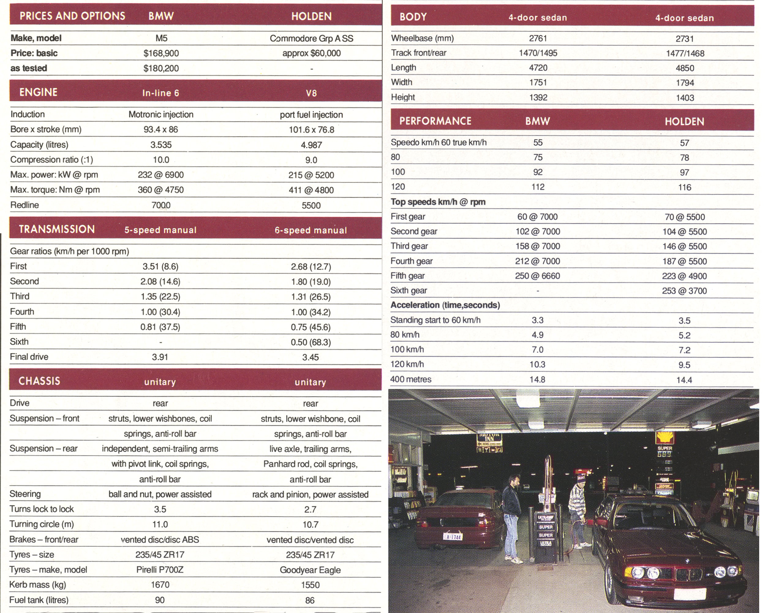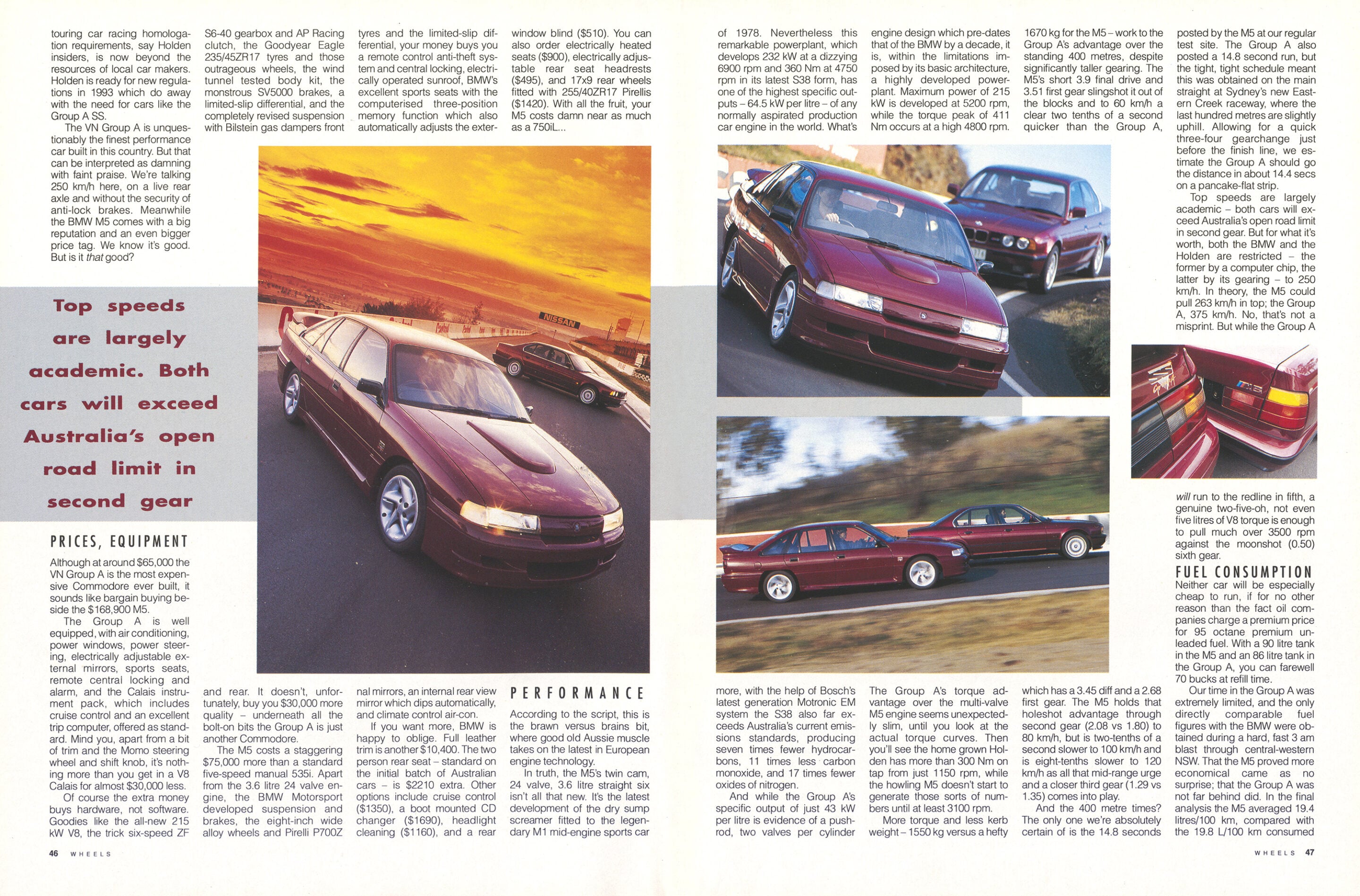 Our time in the Group A was extremely limited, and the only directly comparable fuel figures with the BMW were obtained during a hard, fast 3am blast through central-western NSW. That the M5 proved more economical came as no surprise; that the Group A was not far behind did. In the final analysis the M5 averaged 19.4 litres/100km, compared with the 19.8 L/100 km consumed by the Group A. A further 700 km of mixed highway cruising, flat out track work and city driving in the M5 saw a worst of 18.2 L/100km and a best of 10.5 L/100km.