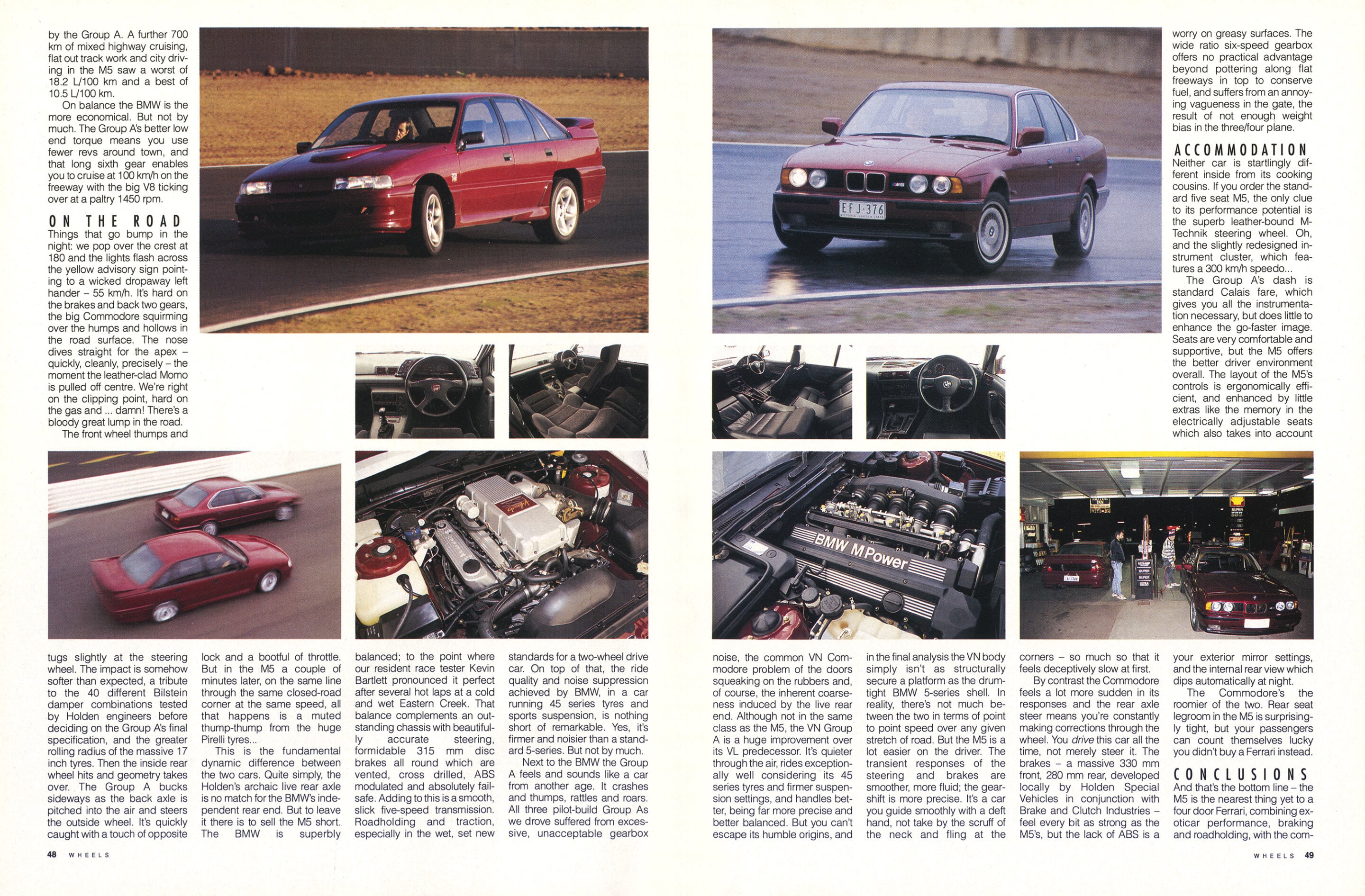 Next to the BMW the Group A feels and sounds like a car from another age. It crashes and thumps, rattles and roars. All three pilot-build Group As we drove suffered from excessive, unacceptable gearbox noise, the common VN Commodore problem of the doors squeaking on the rubbers and, of course, the inherent coarseness induced by the live rear end. Although not in the same class as the M5, the VN Group A is a huge improvement over its VL predecessor. It’s quieter through the air, rides exceptionally well considering its 45 series tyres and firmer suspension settings, and handles better, being far more precise and better balanced. But you can’t escape its humble origins, and in the final analysis the VN body simply isn’t as structurally secure a platform as the drum-tight BMW 5-series shell.