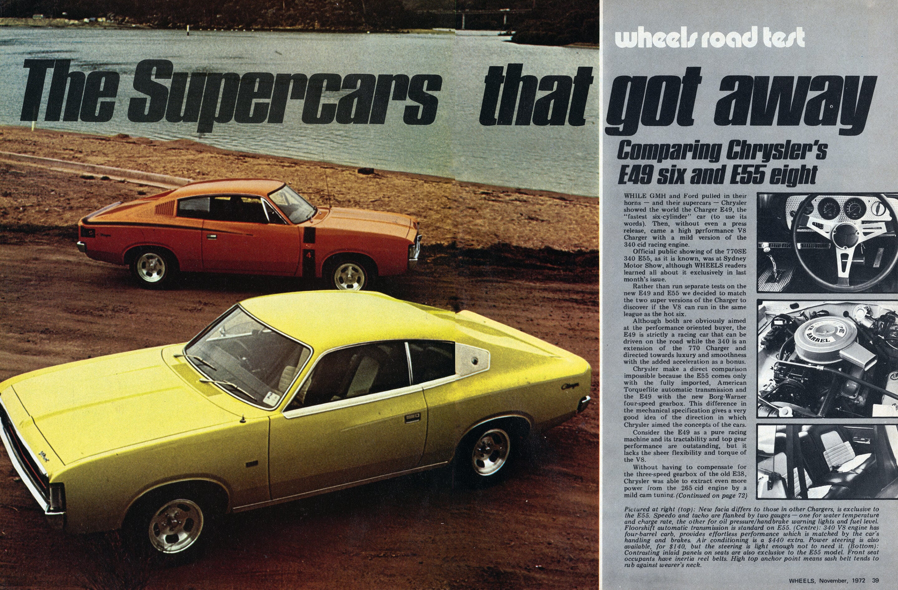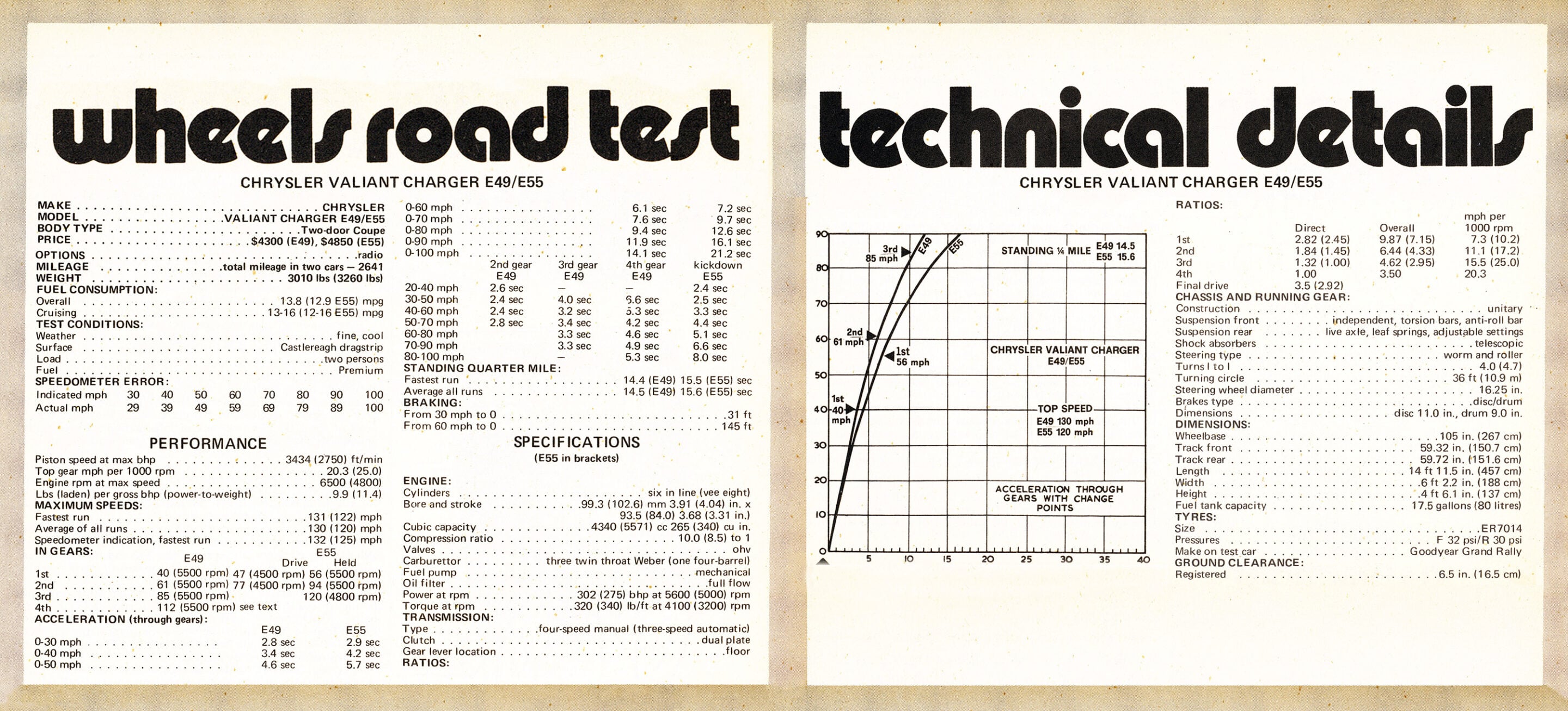 One area which still needs watching are the brakes. Both the test E49 and E55 came with power-assisted disc and in each instance the brakes could be made to fade badly after a couple of stops from 80mph. The poor quality linings used in the Chargers – and the same comment applies to the Falcon GT and Monaro GTS – should be corrected immediately if the manufacturers are serious about primary safety. Another problem on the E55 was rear wheel lock-up coming into a corner.