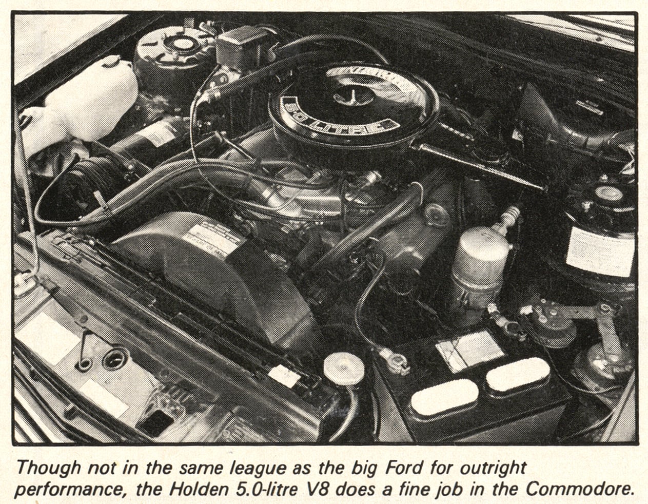No such room for confusion existed with the Commodore because it was a much simpler package, albeit considerably more expensive than the Falcon. The test car’s tag started at $10,828 for the 4.2-litre SL/E and rose in one self-contained $366 jump to $11,194 with the dual-exhaust 5.0-litre engine, close-ratio four-speed manual gearbox, and rear speaker. Helping account for the difference in price (against the Falcon) were the SL/E’s headlight wash/wipe system, locking fuel cap, electric antenna, velour headlining, AM/FM radio-cassette, power steering, air conditioning, remote control boot lid, driver’s seat height adjustment, and bumper overriders.