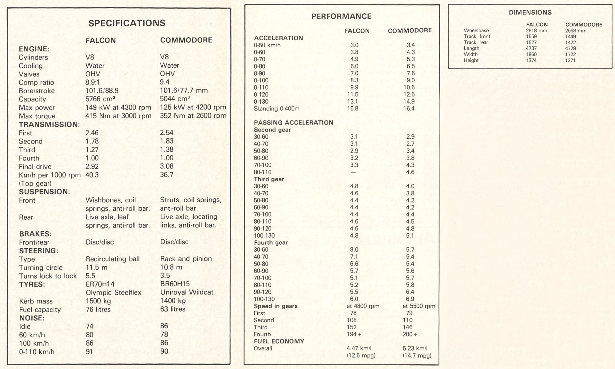 For all its shimmering and shaking at standstill the Falcon proved to be the quieter of the two at idle, by a big margin. It was slightly noisier than the Commodore at steady 60 km/h and during maximum acceleration, but there was no difference between them for 100 km/h cruising. Both in fact are pleasantly quiet in normal conditions with little wind, road and other noises to disturb the relative calm. Indeed it was perhaps because of them being so un-noisy in other ways that the gearboxes’ growls seemed notably obvious.