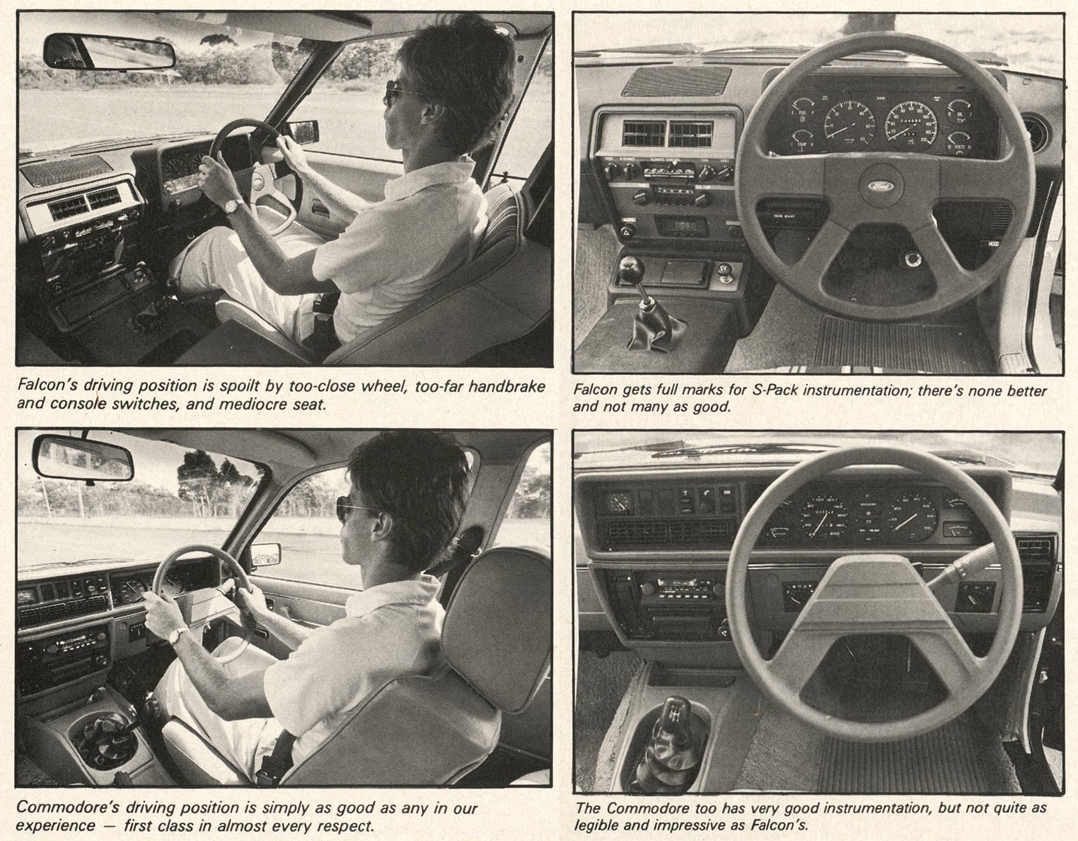 The Commodore also wins at the front for its buckets give more support than the Falcon’s while offering the advantage of height adjustment and a wider choice of positions which (unlike the Falcon) enables tall drivers to put the wheel at arms’ length.
