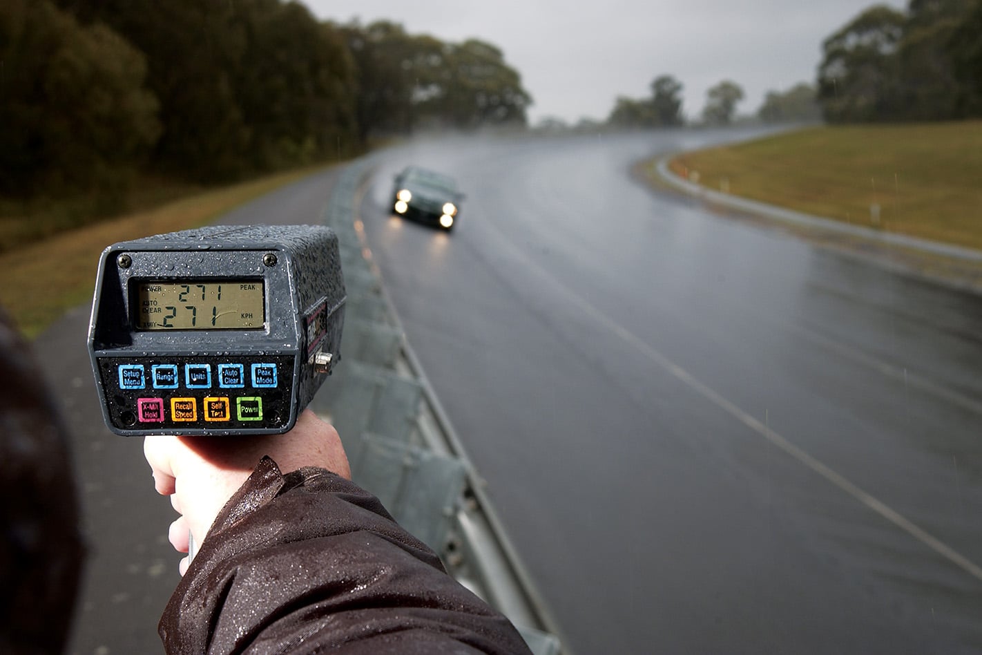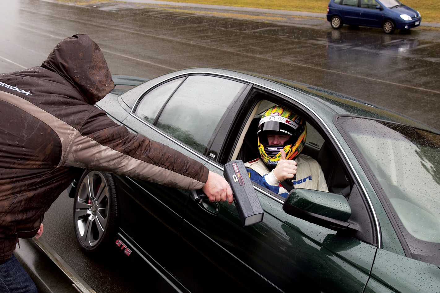 We adjourn to the warmth of ‘the chalet’, the meeting room next to the skidpan. Rain is still lashing the proving ground and time is ticking away. Murph’s getting edgy. He wants a result, but he also has to be at the footy by 2.30pm. Then he has – pardon the pun – a brainstorm, and drives off with Davis. Twenty minutes later he’s back with the windscreen smeared with water-repelling Rainex, the same product used on race cars.