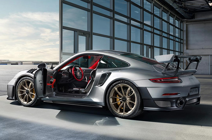 – The GT2 RS has unusual weight distribution of 39:61 front to rear. Various wings and aerofoils festooning the body can generate up to 350kg of grip-enhancing downforce to help balance it out.