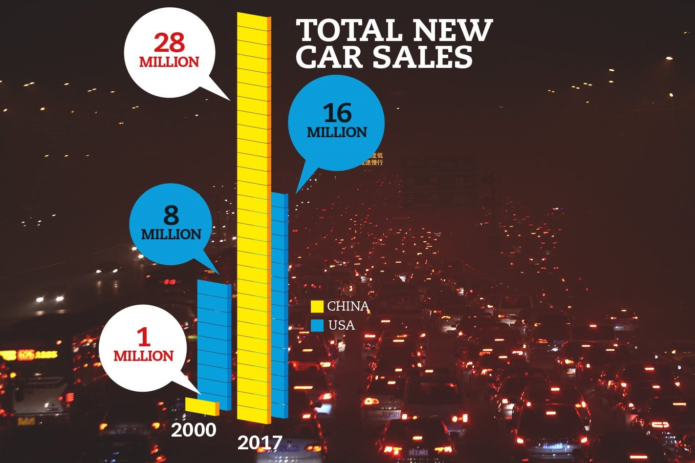So how big is China? In 2000, around a million cars were sold there. By 2017, that figure had risen to 28 million. China overtook the United States in new-car sales in 2009 and now exceeds its nearest rival by around 12 million sales each year, despite America’s impressive post-crash recovery.