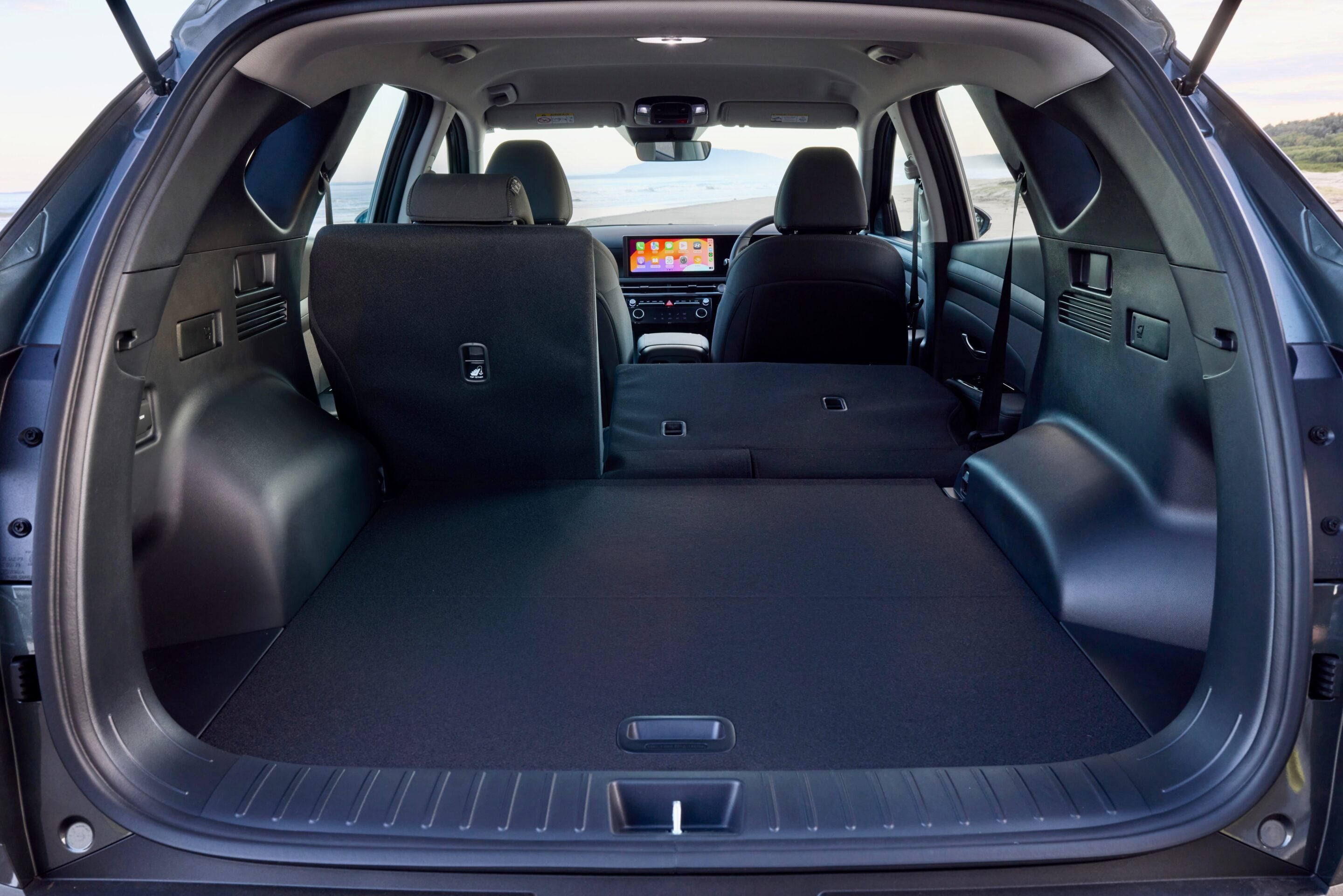 With the hybrid drivetrain – which you should definitely choose if you’re considering a Tucson – the Tucson’s boot measures up to 1903 litres with the rear seats folded, which is larger than any other mid-size SUV. Choosing the petrol engine actually reduces the capacity to 539 litres with the rear seats up and 1860 litres with them folded because it features a full-size spare wheel. That is 43 litres less than the hybrid, but still quite large.