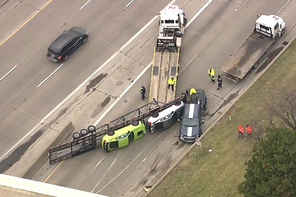 Trailer carrying a pair of Ford Mustang GT500s flips on highway