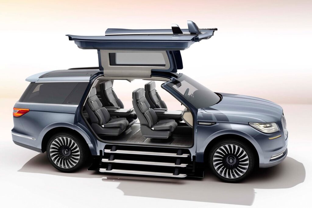 The Lincoln Navigator Concept is making a big splash in the Big Apple with fancy features such as massive gullwing doors, a deployable ‘staircase’ for cabin entry, and a wardrobe management system.