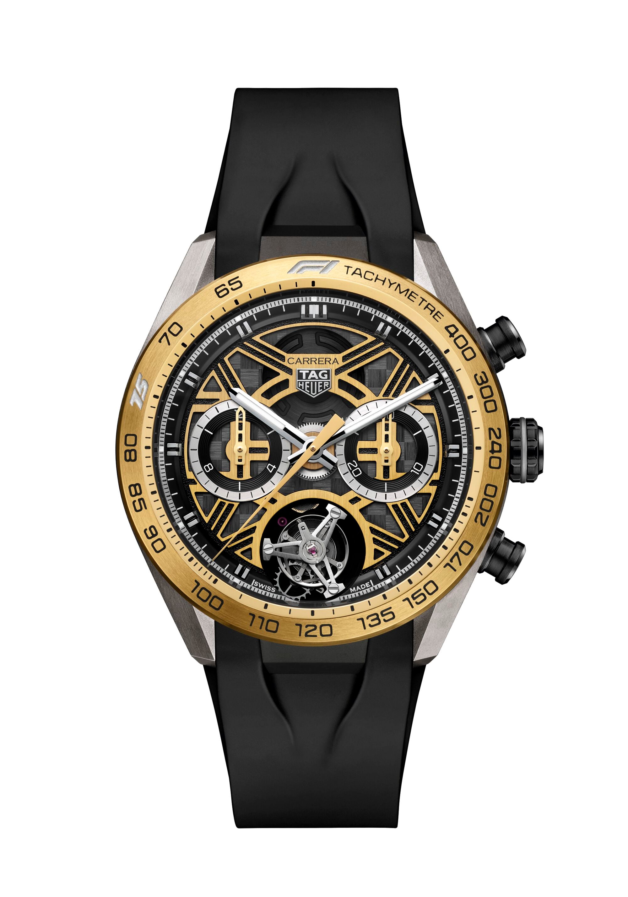 This new edition reflects both the brand’s modern technological approach and its legacy as Formula 1’s official timekeeper. Each watch features a 44mm sandblasted titanium case, complemented by an 18-carat yellow gold fixed bezel and black DLC-coated crown and pushers. A black rubber strap and matching titanium buckle add a sport-focused finish suited to the Carrera’s racing lineage.