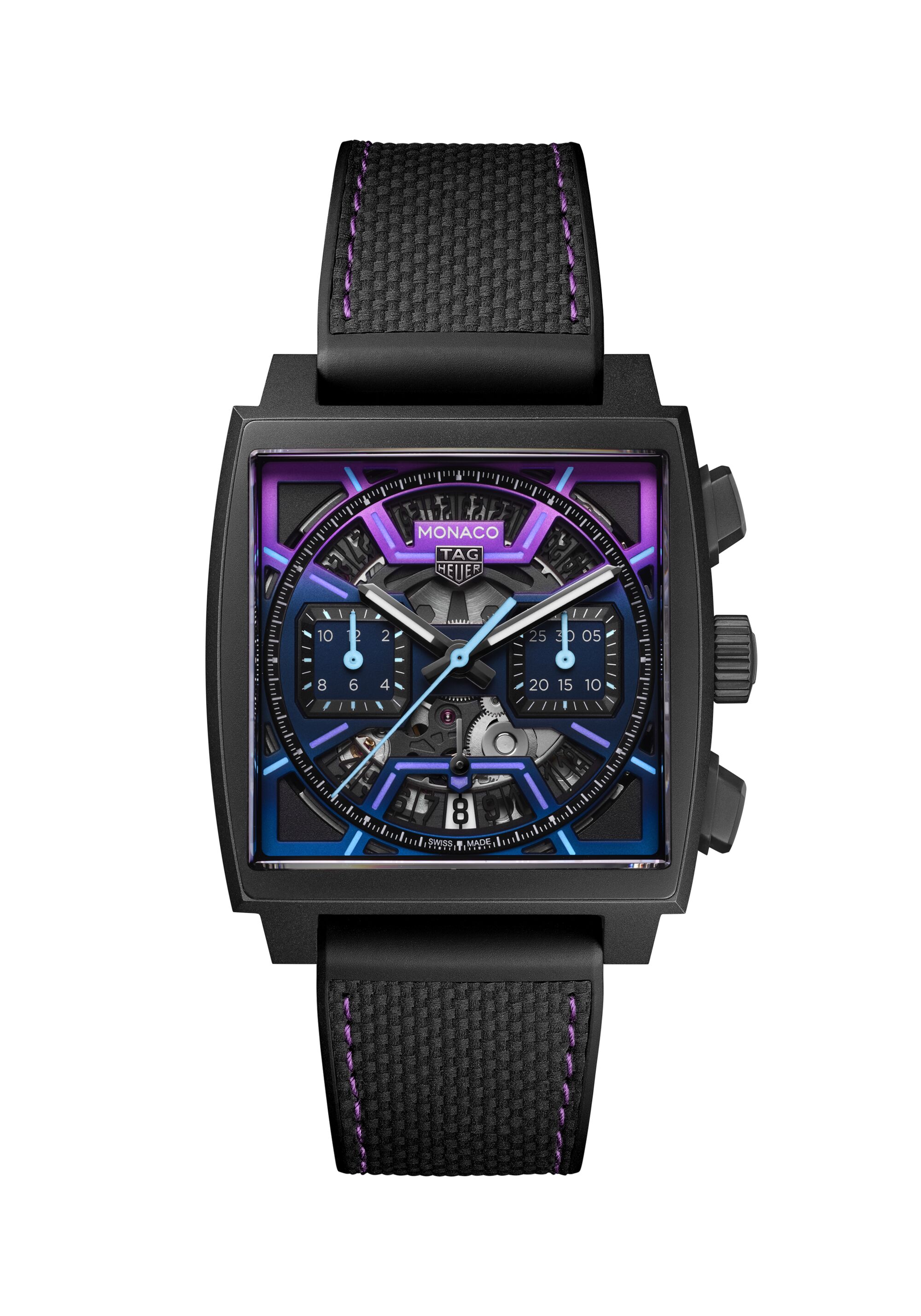 The new edition centres on a 39mm case made from black DLC-coated titanium – lightweight, scratch-resistant and markedly different from the steel cases that defined early Monaco models. The dial is fully skeletonised, revealing the movement beneath while fading from violet to deep blue. TAG Heuer says the gradient is meant to evoke the transition from dusk to darkness, similar to the setting of night races in cities such as Singapore or Las Vegas.