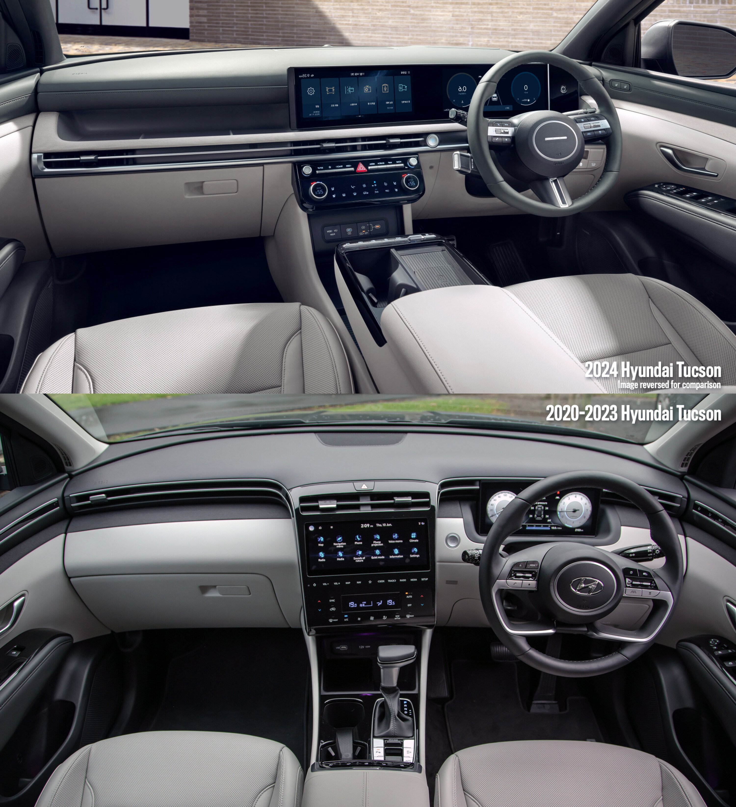 Inside, the changes are more drastic, with a completely new dashboard – inspired by the Kona and Santa Fe – featuring dual 12.3-inch displays running the brand’s latest ‘CCOS’ software, a touch-type climate control panel, a column-mounted gear selector, a new steering wheel, and USB-C ports.