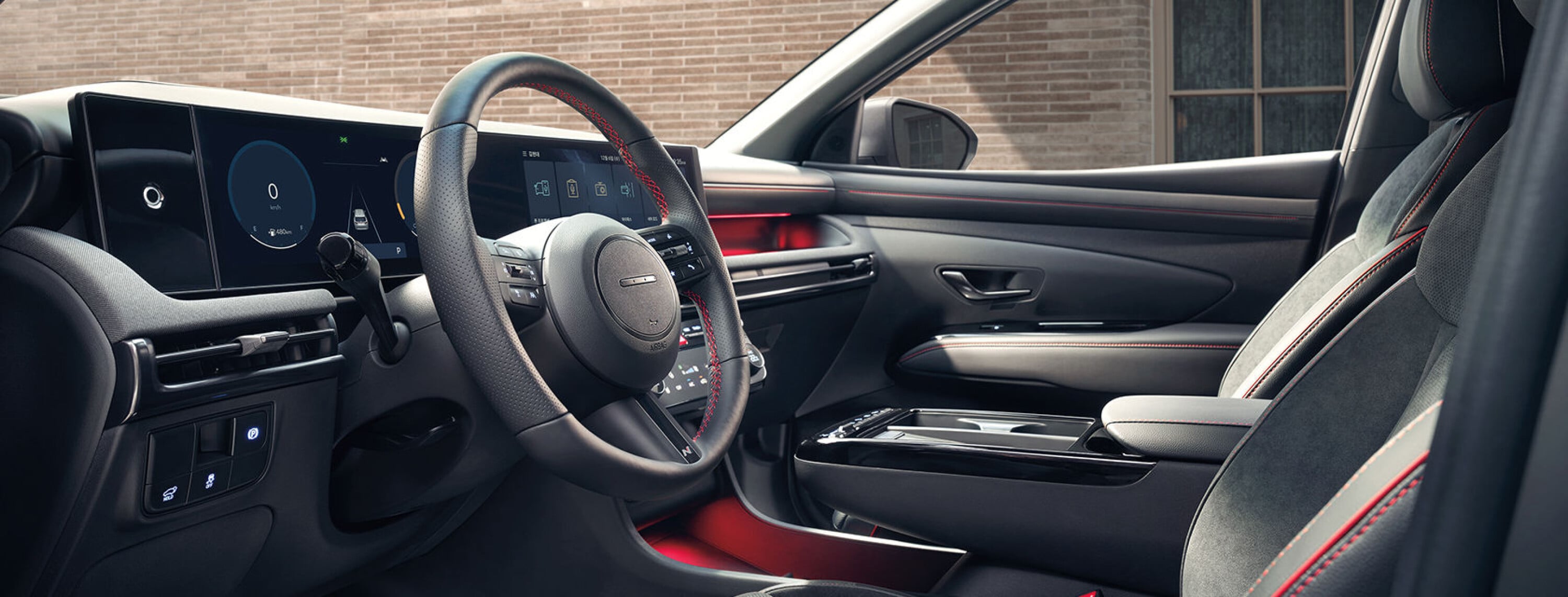 Inside, there’s suede and leather seats trim with red stitching throughout the cabin, and a dedicated N version of Hyundai’s new steering wheel. (Yes, the one with four dots representing H in morse code, in place of the dated H logo still featured on the outside.)