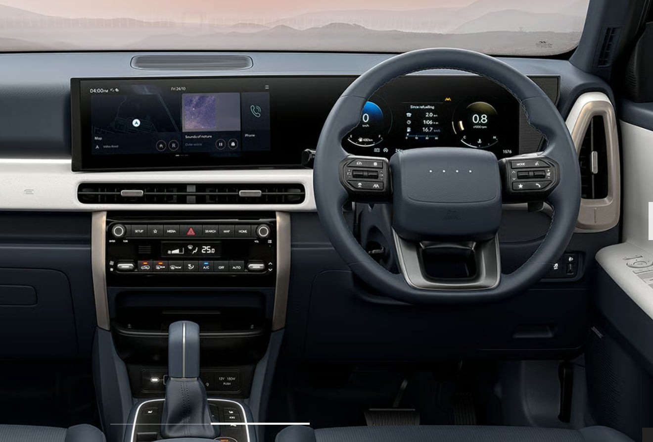 Inside, the Venue has undergone just as radical a change. A new dual 12.3-inch curved display integrates both the digital instrument cluster and infotainment system, giving the cabin a high-tech, seamless aesthetic. The interior adopts a Dark Navy and Dove Grey dual-tone theme, complemented by ambient lighting and optional leather upholstery. For the first time, reclining rear seats have been added, boosting comfort for passengers on longer trips.