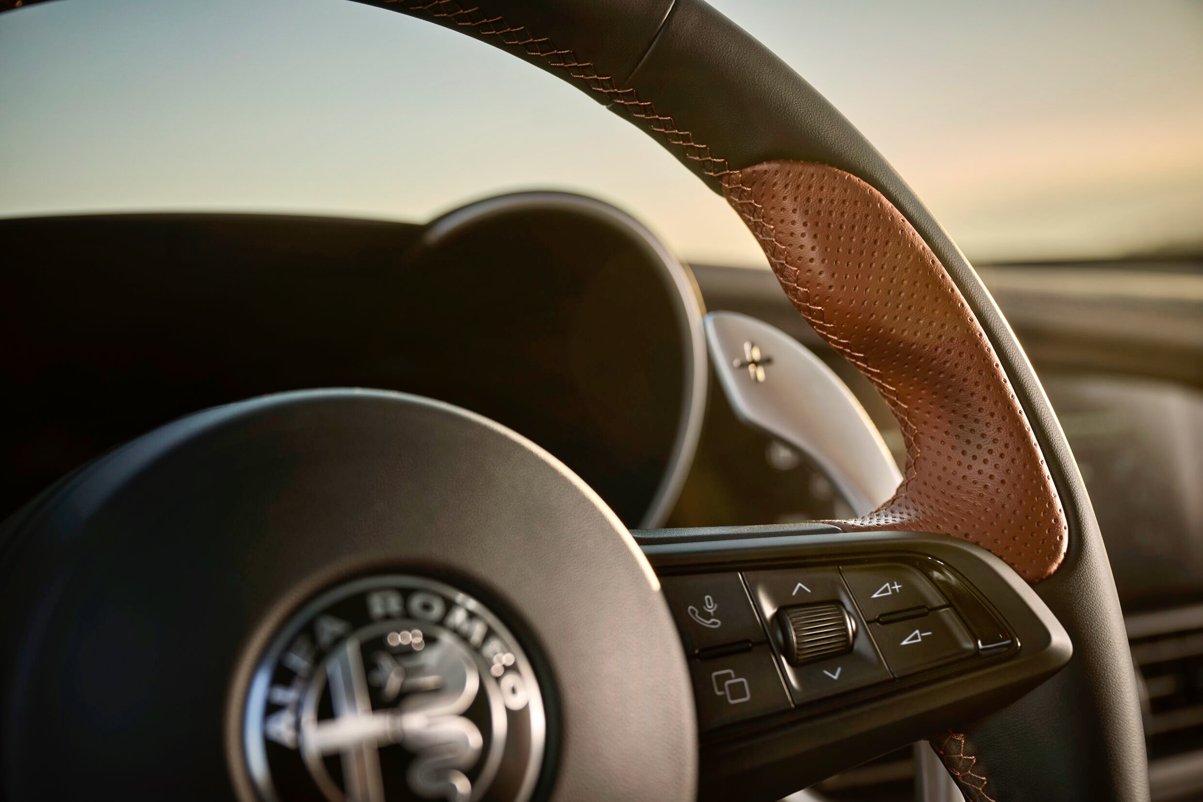 On the inside of the Giulia and Stelvio Intensa Special Series model is black leather upholstery with tan stitching, a tan Alfa Romeo logo on the headrests and tan, a two-tone steering wheel with tan accents and contrasting stitching, and Intensa branding embroidered on the front centre armrest and heat-embossed on the inner side panels of the front seats.