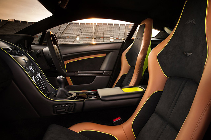 Identifying an AMR-fettled Vantage from one of the countless specials won’t be difficult with a range of four unique exterior themes and two styling packages. The Halo Pack substitutes one of the four two-tone colour schemes for a Stirling Green paint job, complemented by Lime Green accents.