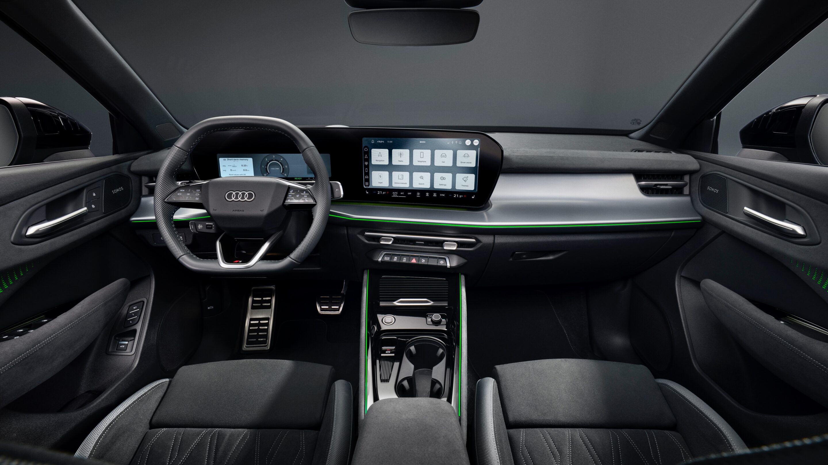 Q3 195kW variants add 20-inch Audi Sport alloy wheels, adaptive dampers, a panoramic glass sunroof, red brake callipers and privacy glass. Inside, the S Line interior package introduces aluminium inlays, stainless steel pedals, a heated sport steering wheel, black headlining, ‘pro’ ambient cabin lighting, a head-up display, Sonos audio and enhanced USB charging capability.