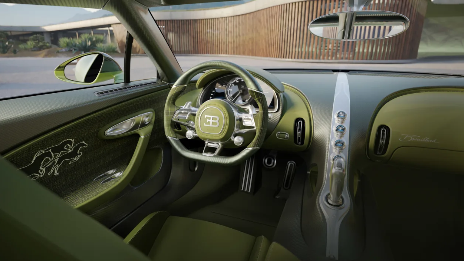The interior is every bit as distinctive as the exterior. Green tartan upholstery, sourced from a Parisian fine textiles house, blends with green-tinted carbon fibre detailing. The enclosed roof allows for the return of the Chiron’s dramatic C-shaped ambient lighting across the cabin.