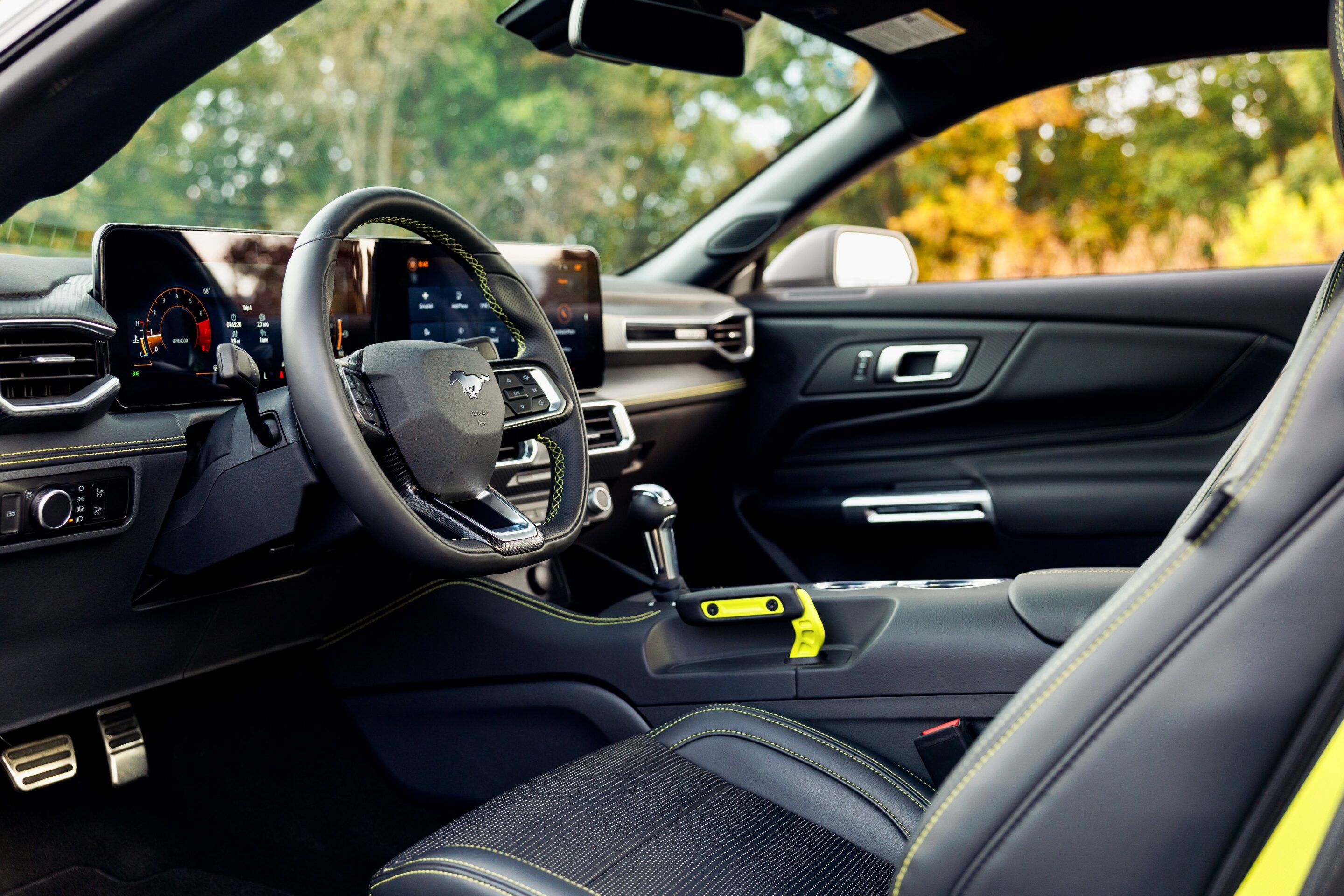The RTR’s cabin includes additional lime accents on the seats and seatbelts, with lime green stitching on the dashboard, centre console and door pockets. The ‘Drift Brake’ hand brake – standard on all Australian Mustang models – is also lime green in colour.