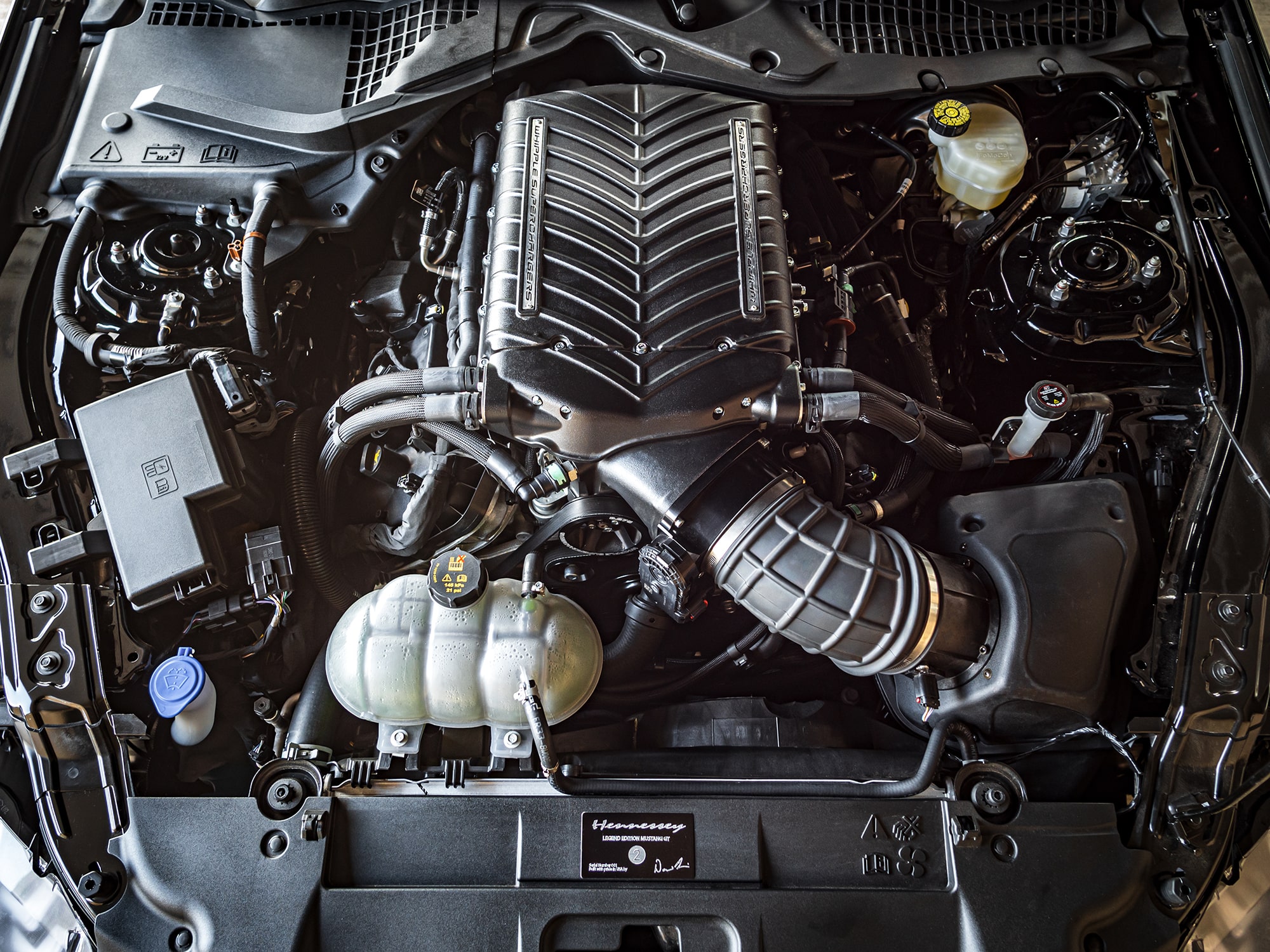 From a mechanical standpoint, the biggest change made by Hennessey is the addition of a 3.0-litre supercharger to the Mustang’s 5.0-litre V8. Supporting modifications include higher-capacity injectors and an up-rated fuel pump, plus a high-flow air intake and Borla stainless exhaust.
