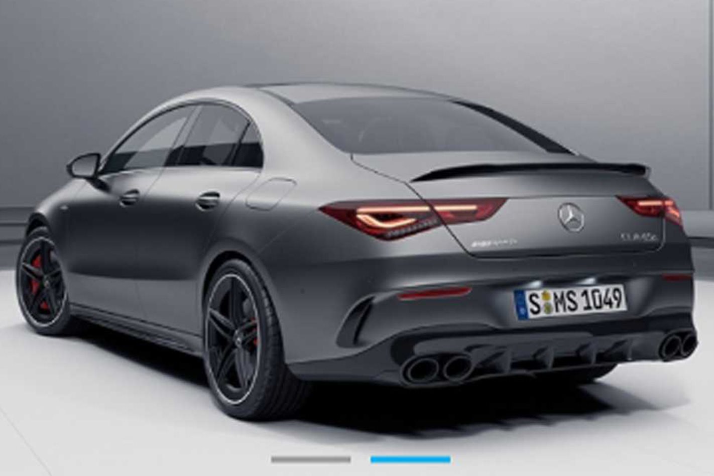 In terms of external changes that will instantly identify the CLA45 over the CLA45, well, we have a pretty clear idea of that thanks to what appears to be an internal balls-up on Mercedes’ own website. On the German configurator for the recently revealed CLA35, there’s an option for the AMG Night package, showing a yellow CLA35. But when you click to get more information on the package, there’s a second photo provided that shows the (officially unrevealed) CLA45 S. The gunmetal grey car is clearly badged as a CLA45, and the rear view shows four large exhaust outlets (the CLA35 has only two) nestled in an aggressive rear diffuser. There are also larger red front brake calipers visible, clamping what appear to be larger diameter brake discs.