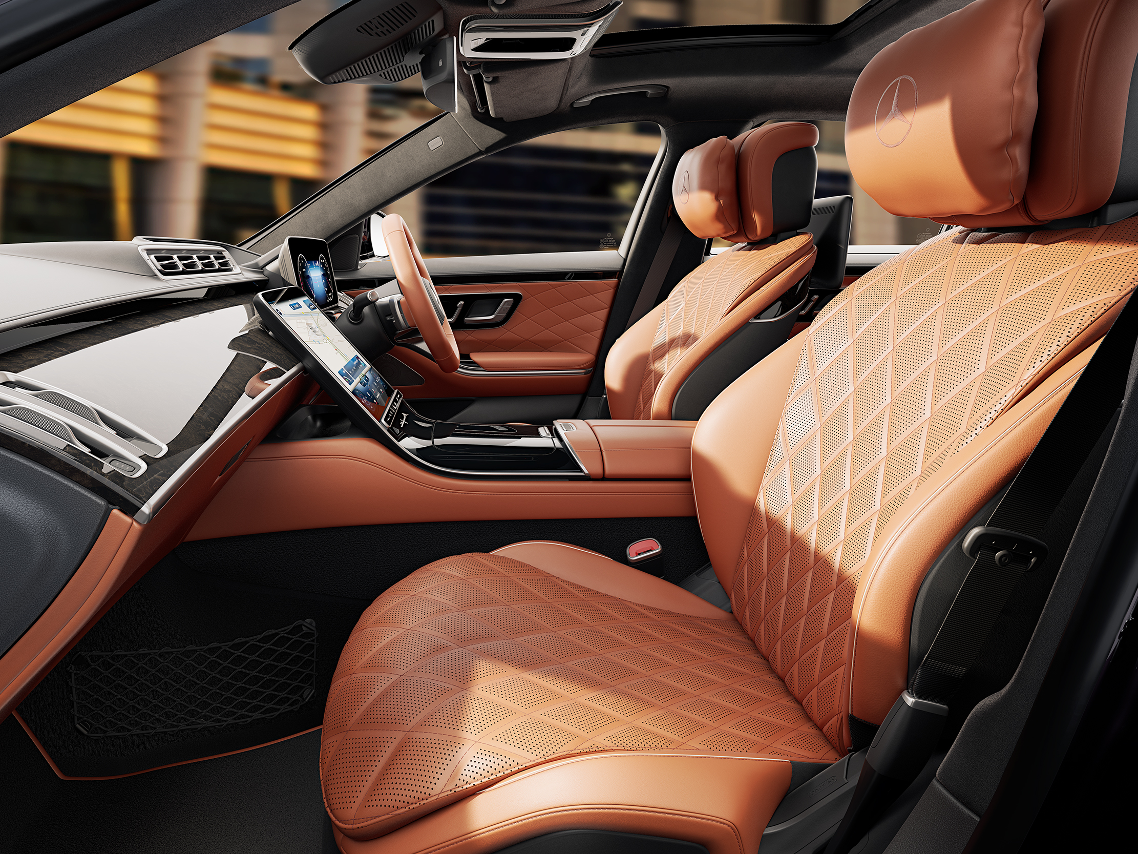 The MANUFAKTUR Exclusive Interior Package for the S 580 L enhances the bespoke upholstery with a suite of luxury-focused features, including: