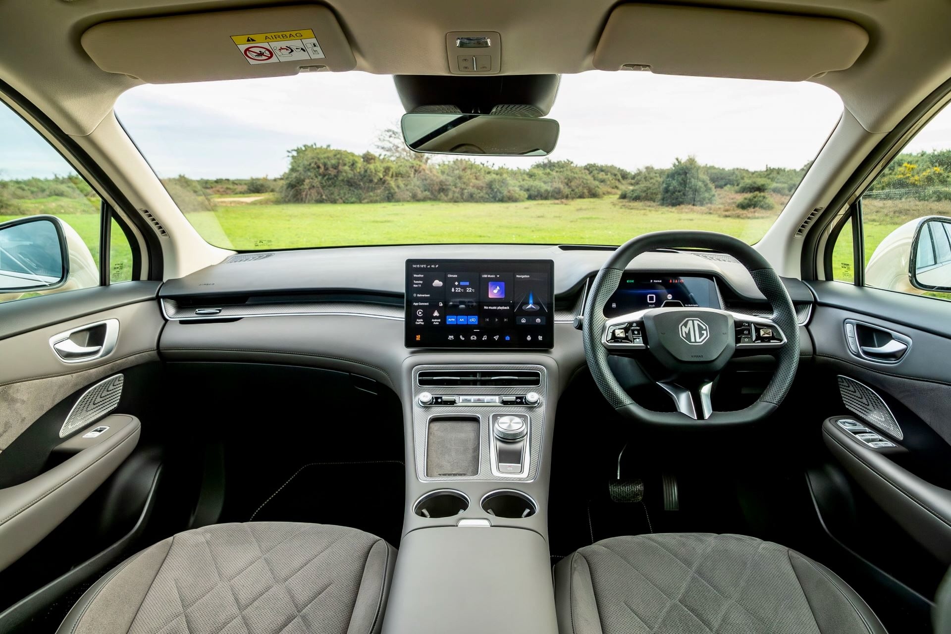 The cabin itself is brand new, and features a dual-screen set-up like the MGS5 EV. All models include a 10.25-inch driver’s display, with a 12.8-inch touchscreen mounted above the centre console. This houses all the usual elements, such as inbuilt sat-nav and the car’s main controls, but MG has listened to customer feedback and still offers a row of physical controls for functions such as adjusting the volume and fan speed.