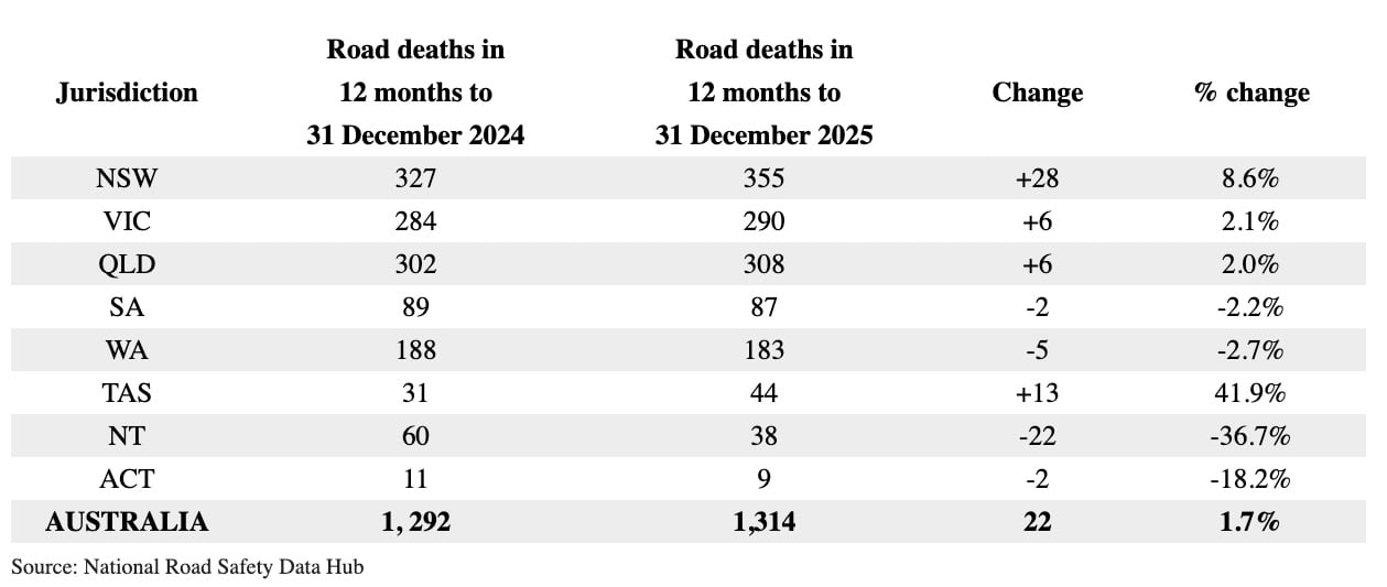 Australia’s road toll increased again in 2025 (by 1.7 per cent) to 1,314 fatalities, meaning that Australia’s road deaths have risen every year since 2021. According to the AAA, that’s the worst sequence of rising road tolls in more than 70 years.