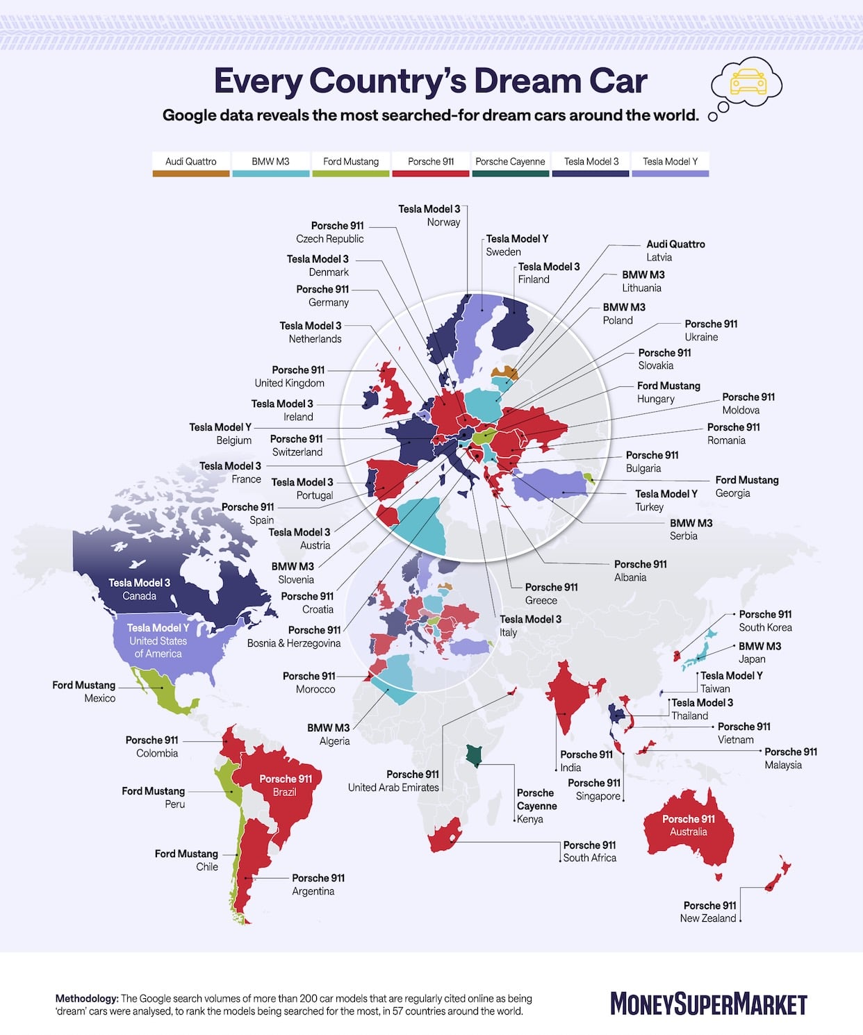 New research from car insurance comparison site MoneySuperMarket has revealed which cars the world dreams of owning the most.  Using a combination of global Google search data and a consumer survey of 4000 drivers worldwide, researchers identified the most searched-for dream cars across the world as well as each country’s top Googled dream model.