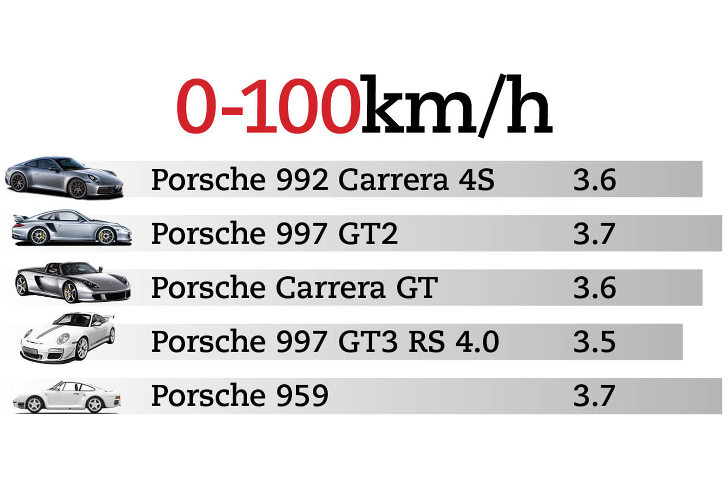 We put the 992 up against some Porsche legends to see just how quick off the mark it is. And the really scary thing? You can make the 992 Carrera S another 0.2s quicker to 100km/h with the optional Sport Chrono Package, so a little judicious optioning would see it become the quickest of this bunch.