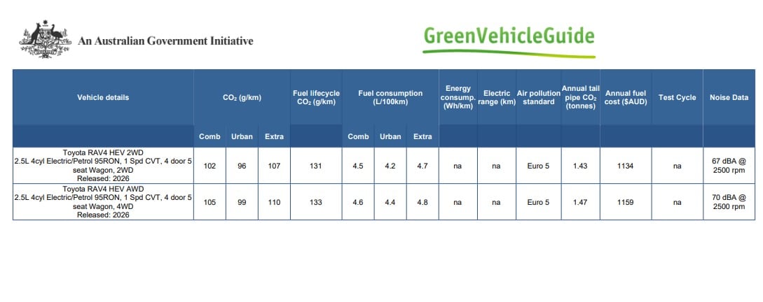 Data for the RAV4 plug-in hybrid is yet to be announced, though it’s expected to be even more efficient on the combined cycle when it arrives in the third quarter of 2026 thanks to its electric-only range, of which Toyota Australia is targeting 100km for.