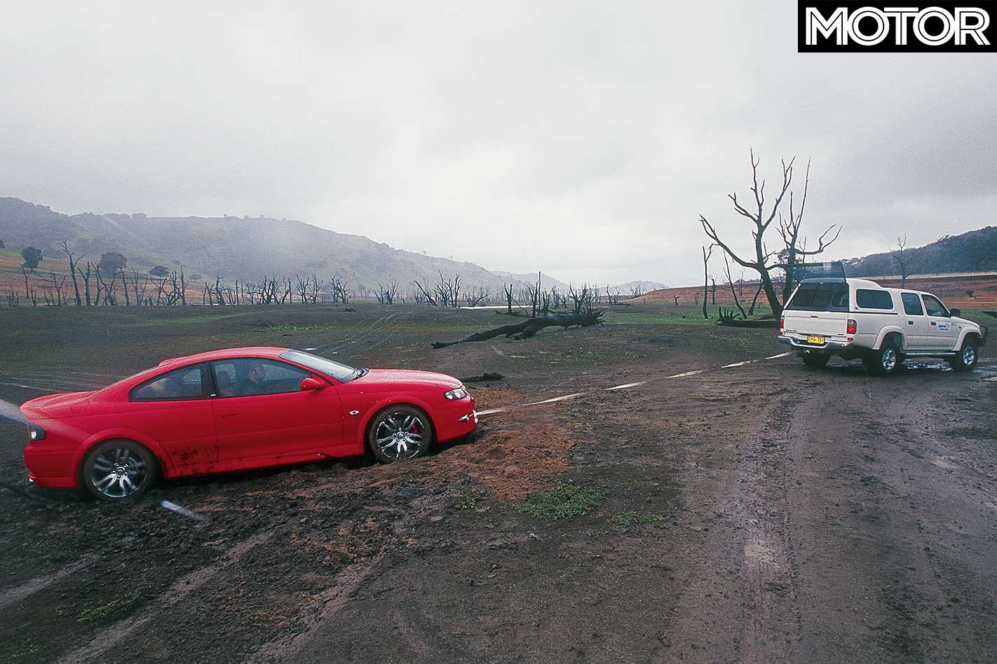 We’d slithered our way to the very edge of the Murray River for what was going to be a killer static shot, and now we sat cocooned in the tan leather cockpit of the HSV Coupe 4 waiting for the teeming rain to ease long enough for snapper Brunelli to brave the elements and fire off a few frames.