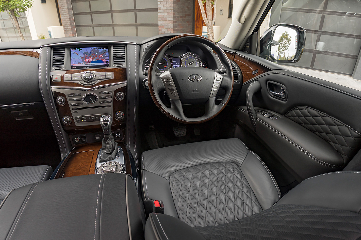 Floor the accelerator, and the engine’s V8 note delivers plenty of aural appeal, too. Don’t do it too often though – natural aspiration, big displacement and a mammoth kerb weight translate into a hefty thirst – Infiniti claims a combined average of 14.5L/100km.