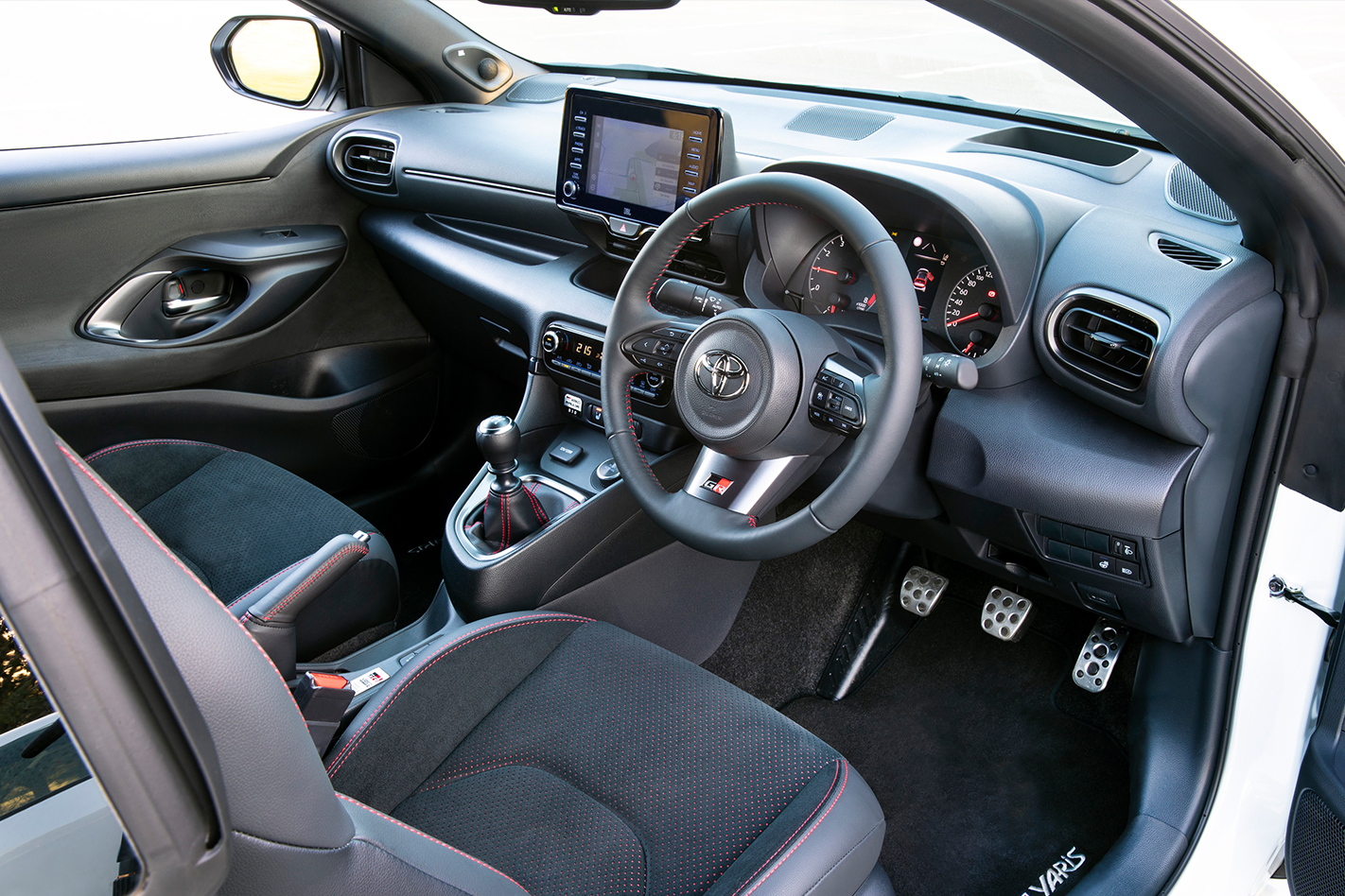 Inside is where the GR Yaris struggles most. It’s reasonably well equipped, with dual-zone climate, keyless entry and start, a 7.0-inch touchscreen multimedia system, eight-speaker JBL stereo, a head-up display, six airbags and a raft of active safety equipment including active cruise control, road sign assist, intersection assistance, blind-spot monitoring and more, but a lot of the trim is made from hard, scratchy plastic.