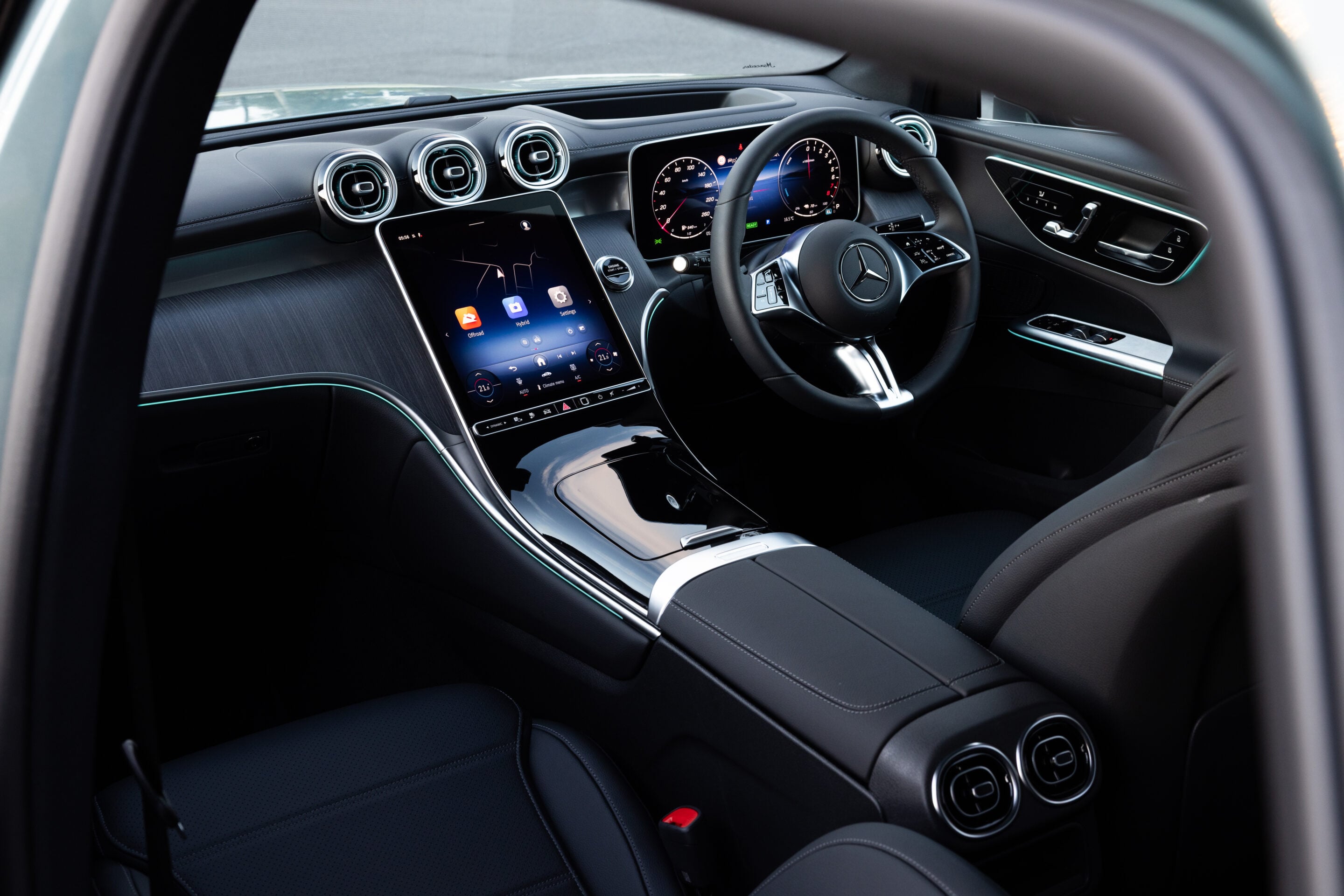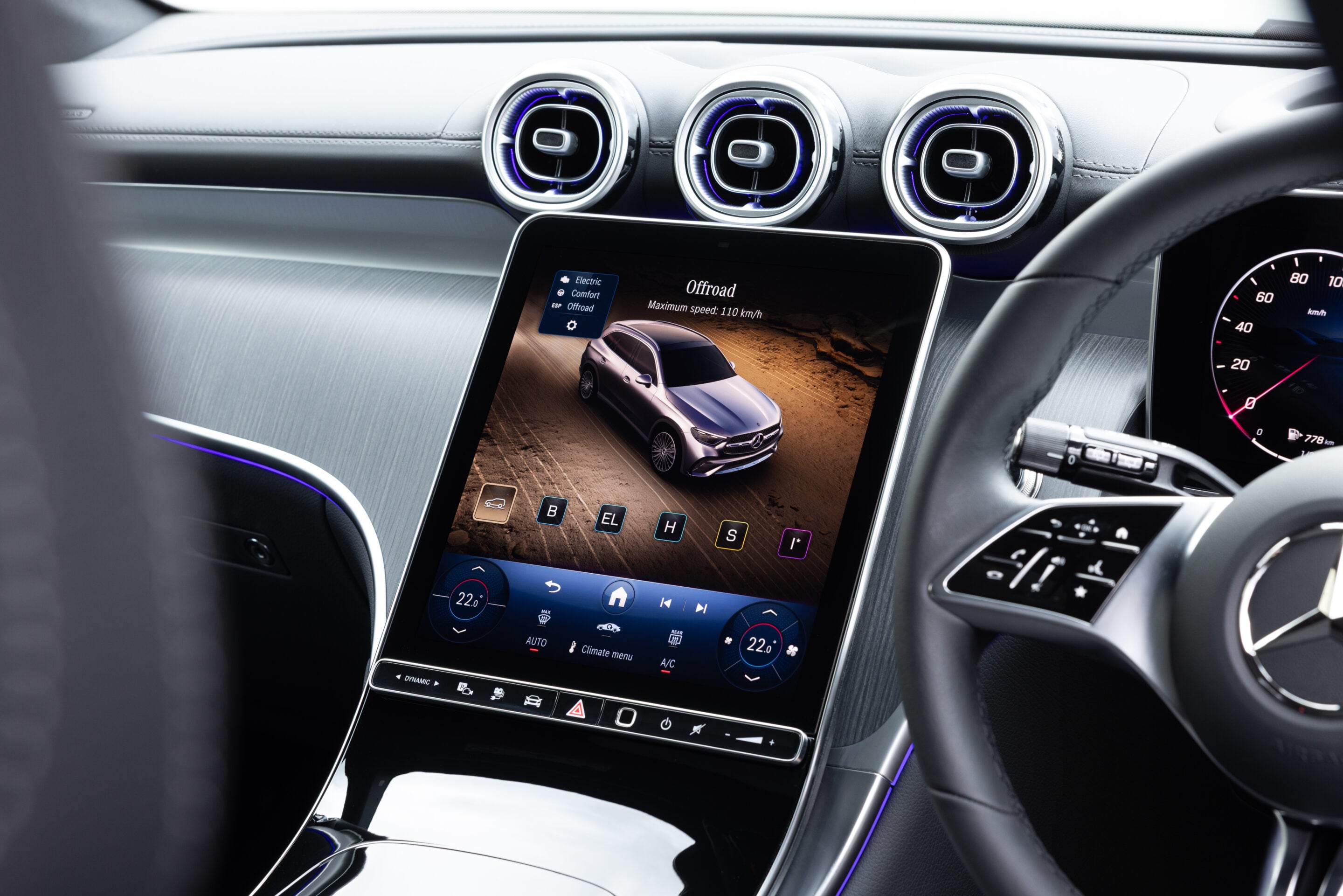 Bringing the GLC 350e in at less than $100,000 (just) is a smart move on Mercedes’ part, and the vehicle feels well equipped for that particular price point. As well as the above equipment, buyers can count on a 12.3-inch driver’s display, an 11.3 inch central display, a wireless phone charger, the Ambient Lighting Plus pack, anthracite timber finish for the dash and self-levelling air suspension at the back. One omission that is sorely missed is the Burmester premium stereo that the C 350e gets as standard.