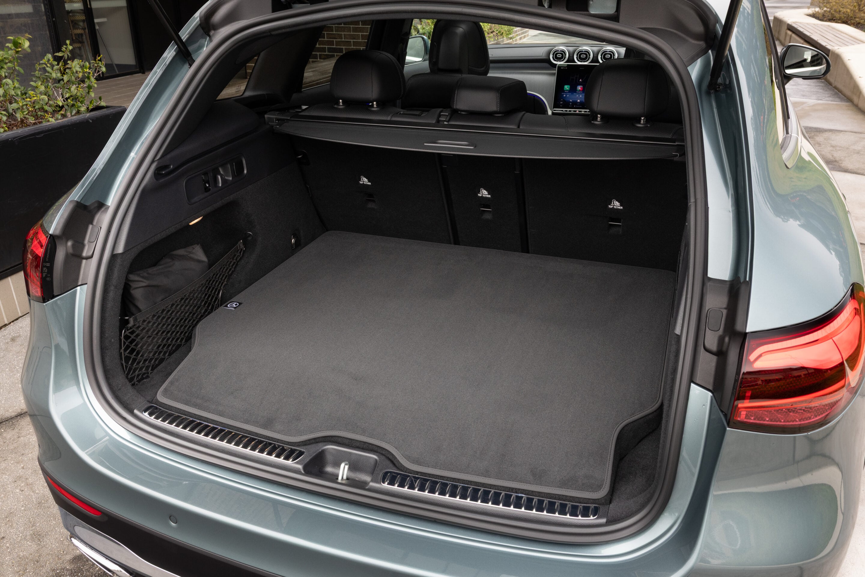 Mercedes has to fit that 96 pouch cell lithium-ion battery somewhere and beneath the boot floor is the chosen solution. This means that there’s no spare wheel packaged with the GLC 350e, the vehicle being supplied with a can of mobility foam and a compressor instead. It also means that buyers lose about 40 litres of luggage space as the boot floor is raised ever so slightly. The GLC has a little trick to claw back 60 litres of space where the rear seats can be moved to a more vertical position.