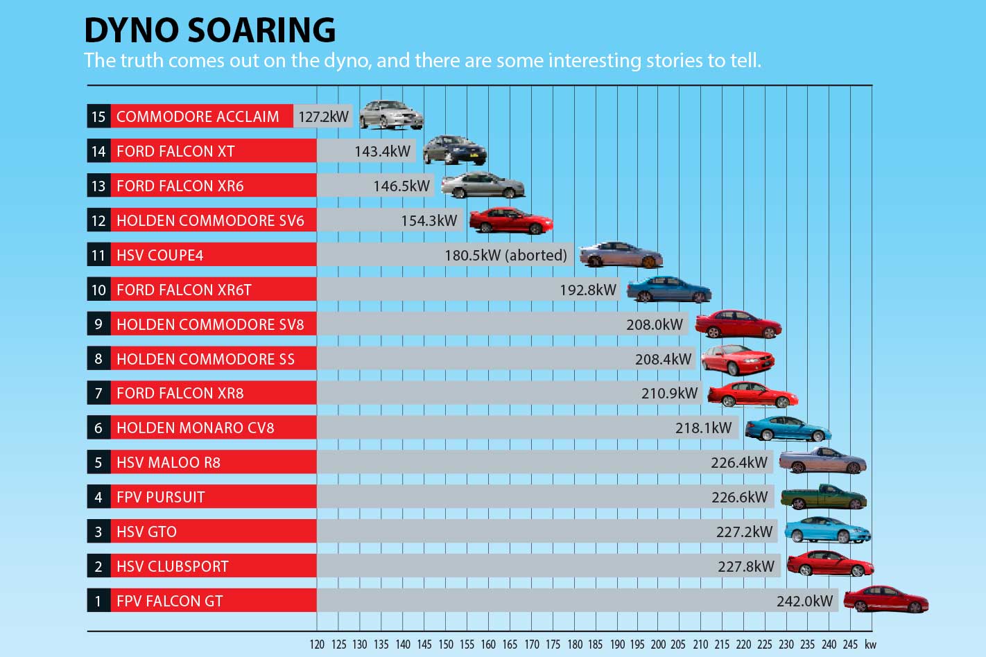 It won the last All Aussie shootout, but this XR6T was never a threat. Its 193kW at the treads (up 8kW) was strong, but the 0-400m time was 0.7 secs off its best. At the Creek, the XR6T went into limp-home mode dropping it a full second behind the SV8. In short, it’s just not fast enough.