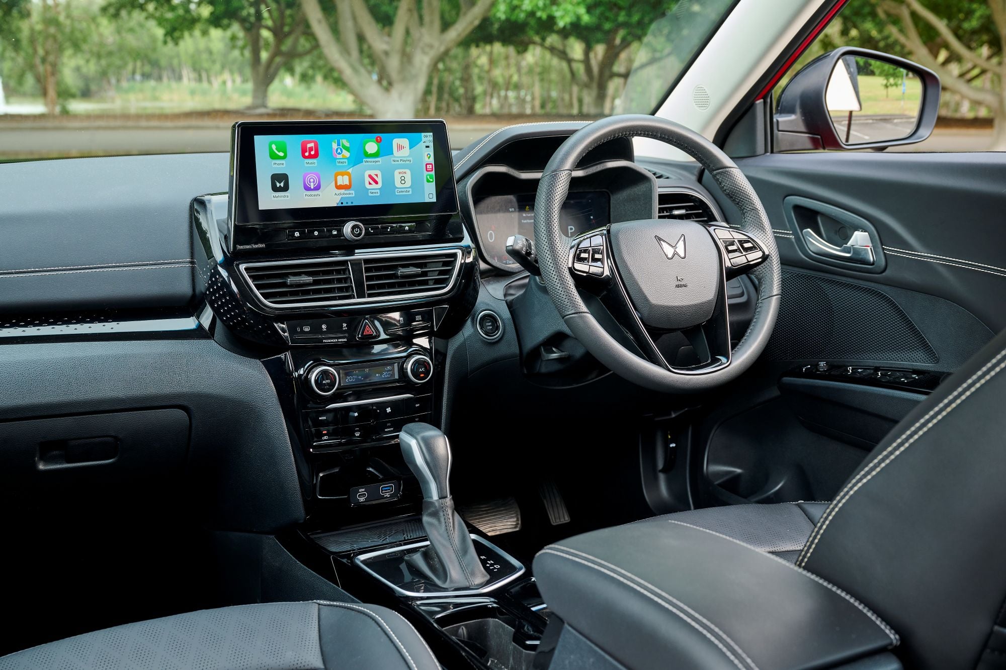And it’s the Mahindra, despite being the most affordable of the three, that has arguably the healthiest list of standard kit. Notable inclusions run to 17-inch alloy wheels, synthetic leather seat trim, two-zone climate control, a 10.25-inch infotainment touchscreen with wireless Apple CarPlay and Android Auto, a 10.25-inch digital instrument display, sunroof, cooled glovebox and a Harman-Kardon audio system. Our test car was finished in Tango Red with a black roof, a $495 option and one of six hues commanding a premium. Don’t want to pay for paint? A white XUV 3XO with black roof is your only option.