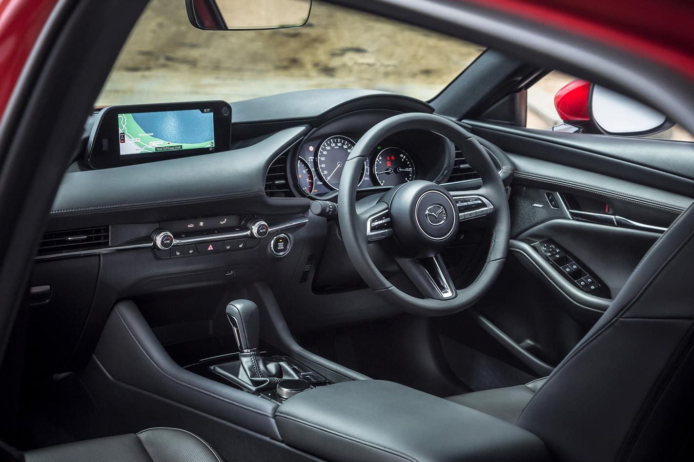 Step inside and there’s also a similar resemblance between all models, Mazda’s designers penning an interior that leaps ahead of simpler rivals into the realm of premium. The soft roll-top gently undulates across the upper portion of the dash where a crisp infotainment system sits neatly tilted toward the driver. Using a high-definition display that features both Apple CarPlay and Android Auto, the infotainment system is a world apart from any Mazda currently sitting on the showroom floor. What puts it in front of competitors is the control system that does away with clumsy touch-screen input to keep driver distraction – moving eyes away from the road – to a minimum (and is also why the crystal-clear head-up display comes standard on every model). Instead of fussing with fingers on the screen, a finely tuned rotary dial teams up with a smaller knob and sensible shortcut buttons that make navigating from CarPlay to vehicle settings effortless. The touch points are all finely finished with a quality feel and tactile response too, and the steering wheel, with its perfectly round rim and logical placement of controls on the spokes is a high-end fitment.