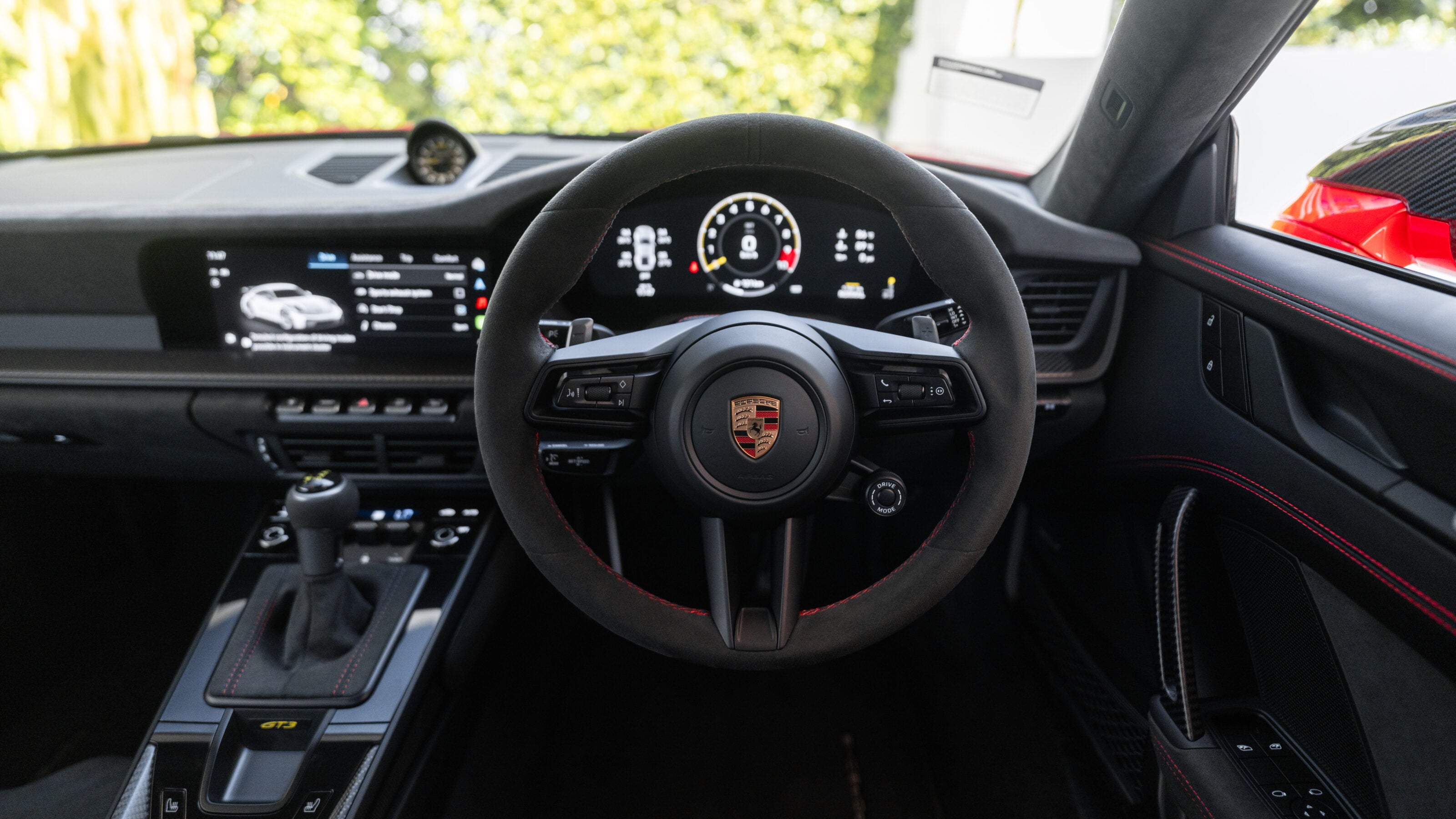 The new digital dash is a neat installation, although die-hards will probably miss the analogue clocks. I love the clarity of the new dial pack, and you can even rotate the rev counter so that the 9000rpm redline is located vertically, like something from the Mille Miglia. It’s a lovely touch. Another piece of thoughtfulness is the fact that the headrest pad is removable. This means that if you’re wearing a helmet, and especially if you’re teaming it with a HANS device, your head isn’t cranked forward by the padding and you can drive in a more natural position on track.